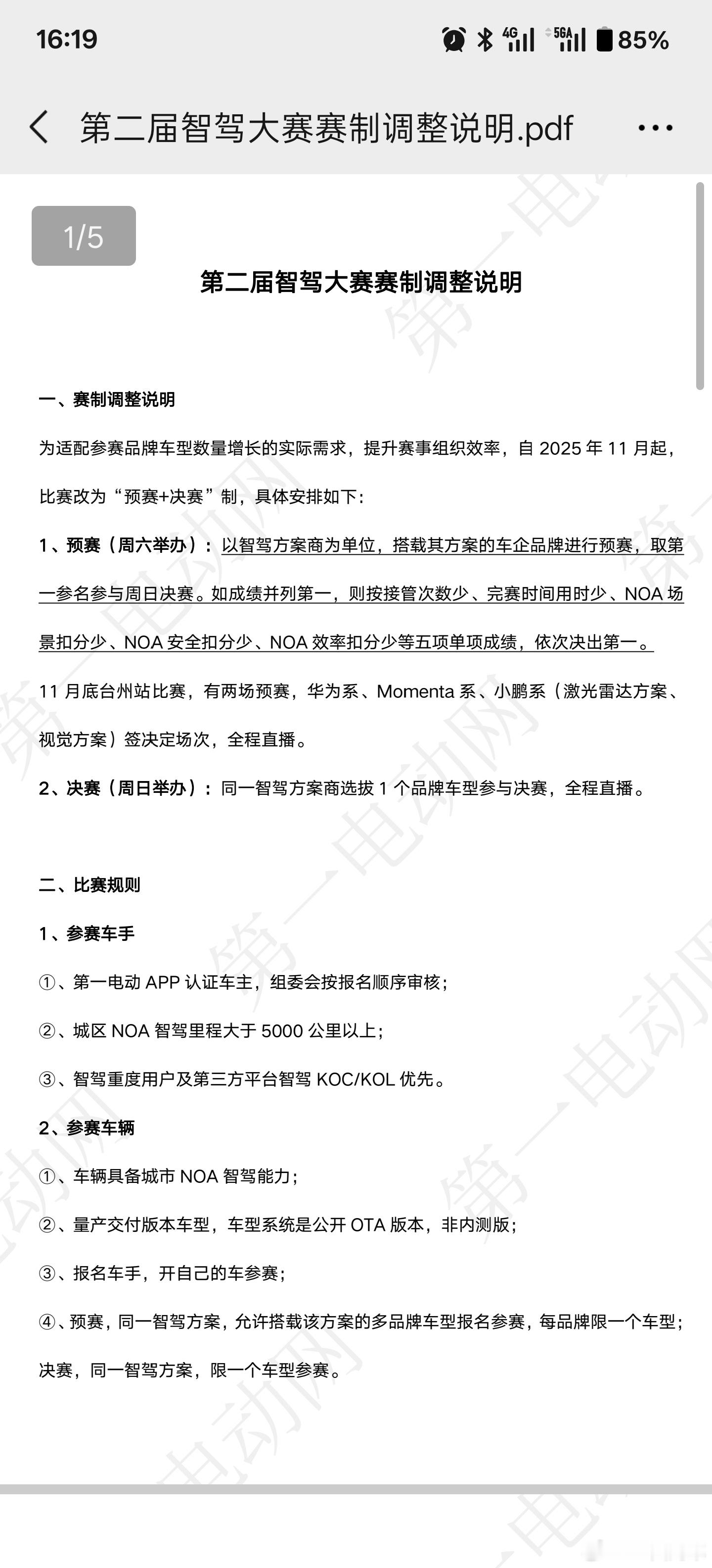 赛制出现重大调整!因为现在参赛的车辆越来越多,近3站都有17台车,导致整个比赛+打分过程过于冗长,同时随车裁判的不确定性导致打分争议不少。 这次调整为比赛分为两天进行,第一天预赛对于同一个智驾方案/供应商的内部竞争,选出一个冠军车型,参加第二天的决赛。(主要是mmt,鸿蒙和小鹏三家,有多个车型需要内部选优)第二天保证在场的车型为每个智驾方案/供应商只有一个车型,压缩比赛时间。另外随车裁判全部改为官方工作人员或者裁判团裁判,避免临时招募的随车裁判的不确定性!这样对某个供应商方案在不同车型上适配水平感兴趣的可以重点看第一天的比赛,对不同供应商方案能力优劣感兴趣的可以重点看第二天比赛。而且整个比赛的时间也会压缩不少,比赛过程和打分过程也会减少时间!同时仍然保留云裁判的双裁判机制+全隐藏路线!期待本月底台州站的精彩比赛!