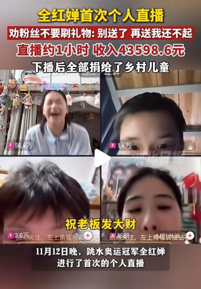 全红婵直播拿打赏, 大家都怪错她了, 不是因为她想当网红, 也不是因为她想赚钱,就是因为蝉宝贪玩,她就想看看直播的界面是怎样,看看直播的朋友,事后蝉宝把赏金全捐出去了,也证明蝉宝仅仅是玩玩。 蝉宝有今天的名气根本就不需要直播打赏,她完全可以做代言或者为家乡做文旅宣传,有人说她以后要做网红了,我觉得这就错了,她做网红根本就是自降身价,也不需要靠打赏赚钱。 她可以走郭晶晶的路线,做做代言或者去体育管理方面发展,前途一点也不成问题,蝉宝年纪还小,喜欢到处探索玩耍,希望她能在比赛之外,能够找到自己的道路。