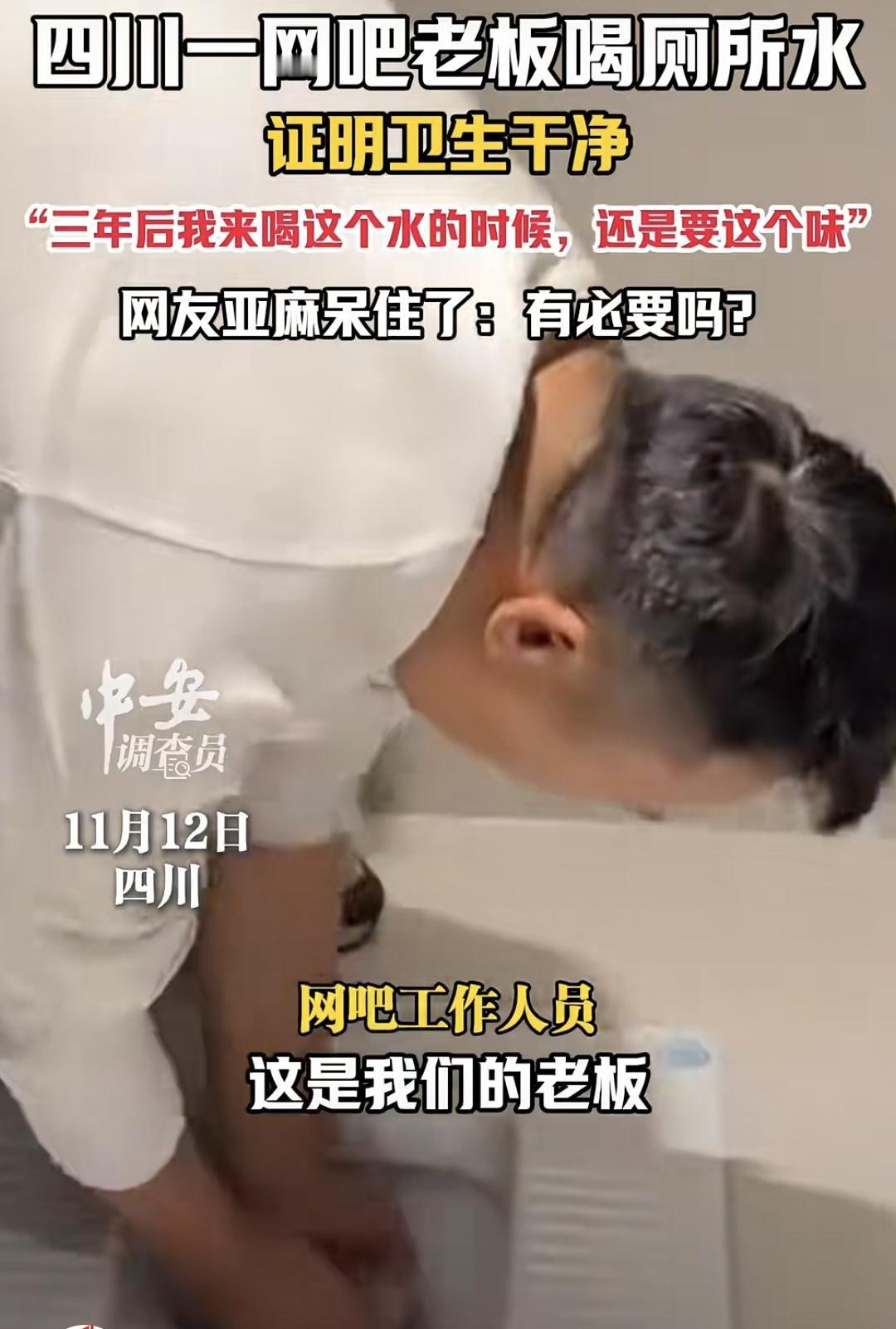 不得不说, 这位老板真的很拼也极端‼️‼️ 捧起蹲坑里的水就放嘴里...... 虽然吐出来没咽下去, 也是用心良苦[我想静静] 并期待3年后再来喝这个水, 依旧要是这个味道! 我真的觉得开网吧, 冲马桶的水干净不干净真的没那么重要[思考] 网吧的卫生条件的确很重要! 但卫生好,不是“用嘴验蹲坑水”啊! 地面无污渍、键盘鼠标定期消毒、 卫生间无异味、 水杯餐具干净无菌这些才是细节问题! 不知道是不是为了博眼球 也是绞尽脑汁豁出去了 创业不易[祈祷]