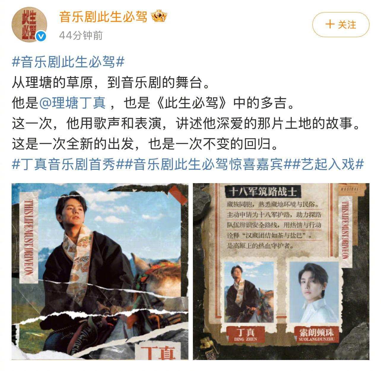 丁真官宣出演谭维维出品的音乐剧《此生必驾》,两个人一位是理塘走出来的少年,为家乡的发展作出巨大贡献,一位是西藏文化宣传大使,一直致力于西藏文化的传播;《此生必驾》这部音乐剧纪念的是川藏公路通车70周年,以1950年代进藏修路为背景,讲述祖孙三代女性的创伤与和解。将在舞台还原修路震撼场面,值得期待。