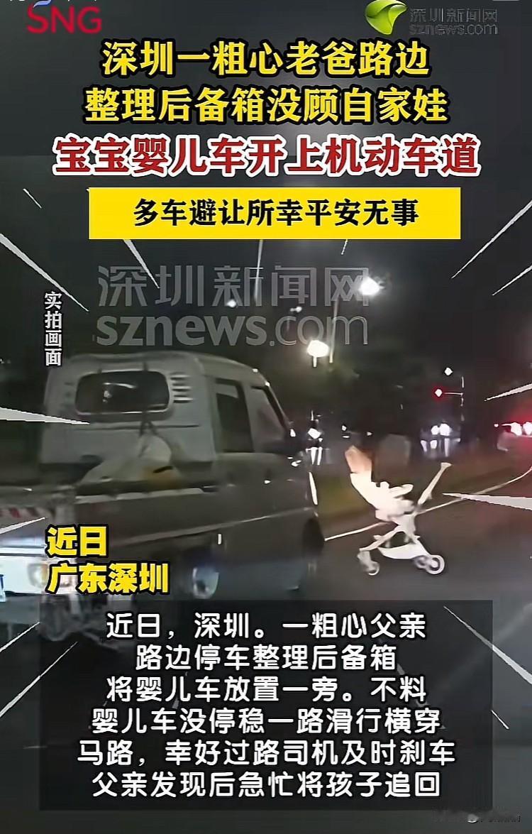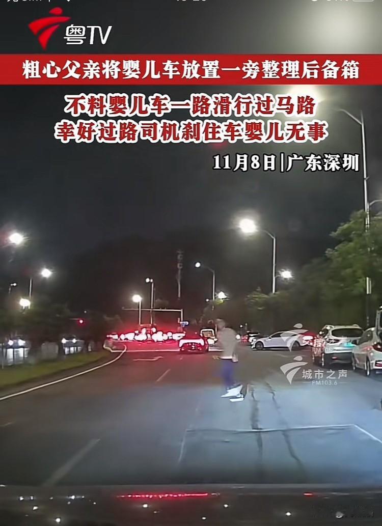 看得胆战心惊!深圳一粗心老爸路边整理后备箱,婴儿车滑过马路。 时间发生在11月9日18:30,路上车水马龙,正是下班晚高峰,这个粗心老爸顾着整理后备箱,把宝宝放在婴儿车上,没料到婴儿车滑走了,直接横穿过马路,幸好司机急刹车,成功避让。这位老爸发现后立马追出马路抱回孩子。所幸孩子没事,车辆也没有因为避让导致交通事故。 真的要严厉批评这位老爸!带娃不能侥幸,要时刻关注小孩的安全,提前预知危险,做好防范措施。停婴儿车多踩一脚婴儿车刹,就不会出现这样危险的一幕。 网友纷纷表示:没有危险的时候,爸爸就是最大的危险。很多爸爸带娃都非常粗心,你们还见过哪些爸爸带娃不靠谱的事情呢?评论留言让更多宝爸宝妈吸取经验吧!