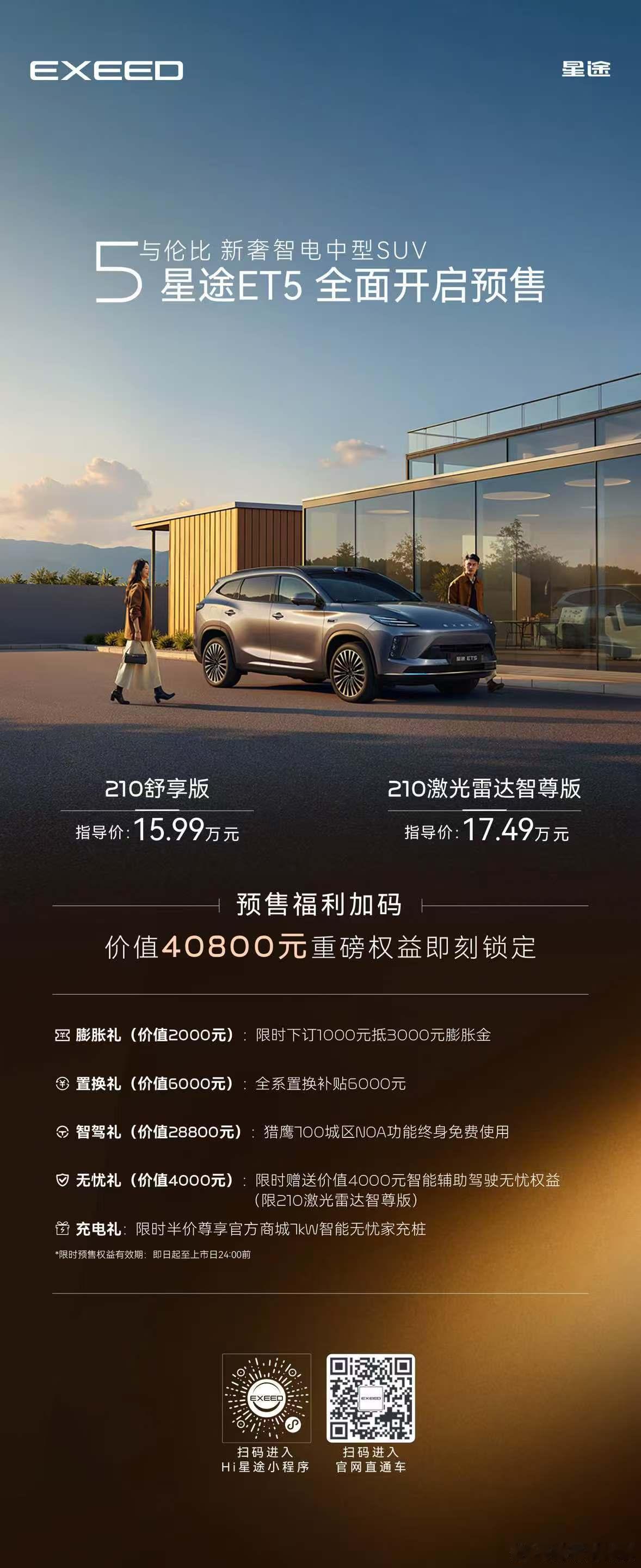 星途ET5 全面开启预售5与伦比 新奢智电中型SUV15.99万元起!预售福利再加码,价值40800元重磅权益即可锁定!