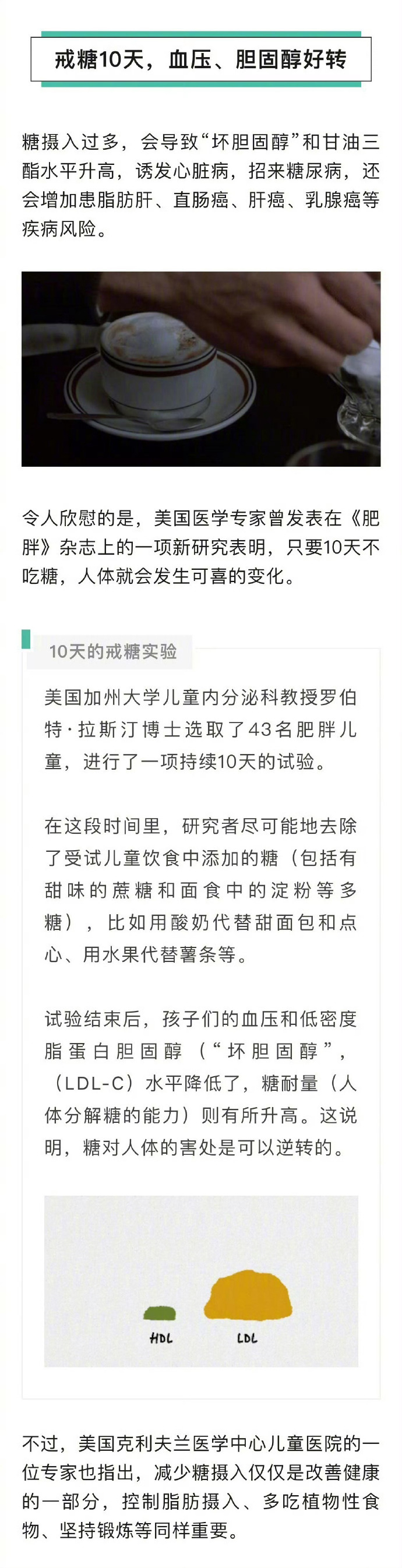 【 你可以坚持几天不吃糖?】从健康角度看,糖摄入过多,会导致“坏胆固醇”和甘油三酯水平升高,增加心脏病、糖尿病、脂肪肝和肿瘤等疾病风险。令人欣慰的是,美国医学专家发表在《肥胖》杂志上的一项研究表明,只要10天不吃糖,人体就会发生可喜的变化↓↓ (生命时报)