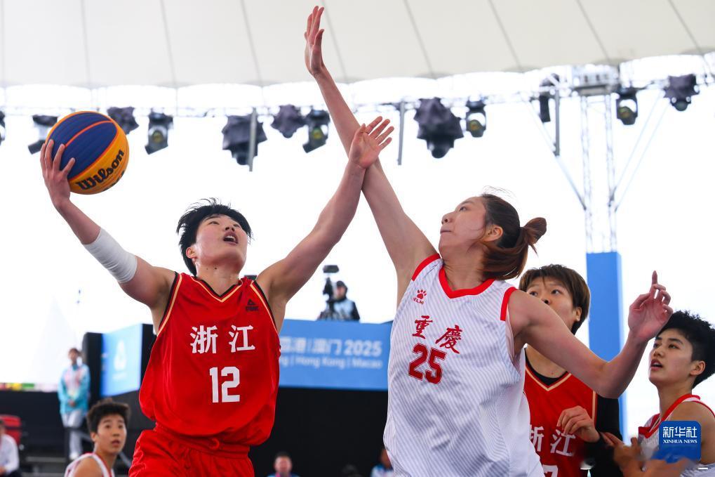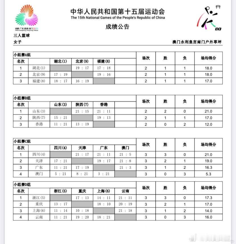 【全运会三人女篮第二日综述:八强对阵出炉 】今日,第十五届全国运动会三人篮球项目比赛进入第二个比赛,小组赛阶段比赛也就此全部结束。1/4决赛对阵:湖北队vs天津队、浙江队vs陕西队、山东队vs重庆队、四川队vs北京队。 重庆队 13-17 浙江队。浙江队王佳琦贡献5分5篮板,万济圆5分,余佳锦4分,孙凤艺3分。重庆队李煜彦得到7分。 云南队 18-21 上海队。张芷婷是上海队发挥最为稳健的球员,她在内线10投9中,还有5个篮板,王悦贡献7分,潘雪梅5分。云南队娜汉8分,难挽败局。 香港队 11-21 山东队。山东队牢牢占据场上的主动,杨衡瑜11分,李文霞5分。 湖北队 17-18 福建队。本场比赛进行得一波三折,湖北队一度3-11落后,但后来居上,最终一分惜败,但仍幸运地获得小组头名出线。福建队林青容7分,赖婷艺6分,黄雅玲5分。湖北队陈玉婕7分,周梦云6分。 浙江队 14-11 上海队。官网暂无数据统计。 重庆队 20-19 云南队。重庆队李煜彦10分,阿呷娜婧5分,文星4分。云南队娜汉11分独木难支。 四川队 21-11 广东队。四川队苏蓥滢8分,张王来7分,四川队三战全胜头名晋级。广东队最后位列第3,未能出线。 澳门队 8-21 天津队。天津队顺利获得晋级资格,赵燕华9分。澳门队三战皆墨。 山东队 21-15 陕西队。山东队两战全胜以小组第一晋级,杨衡瑜独砍13分。