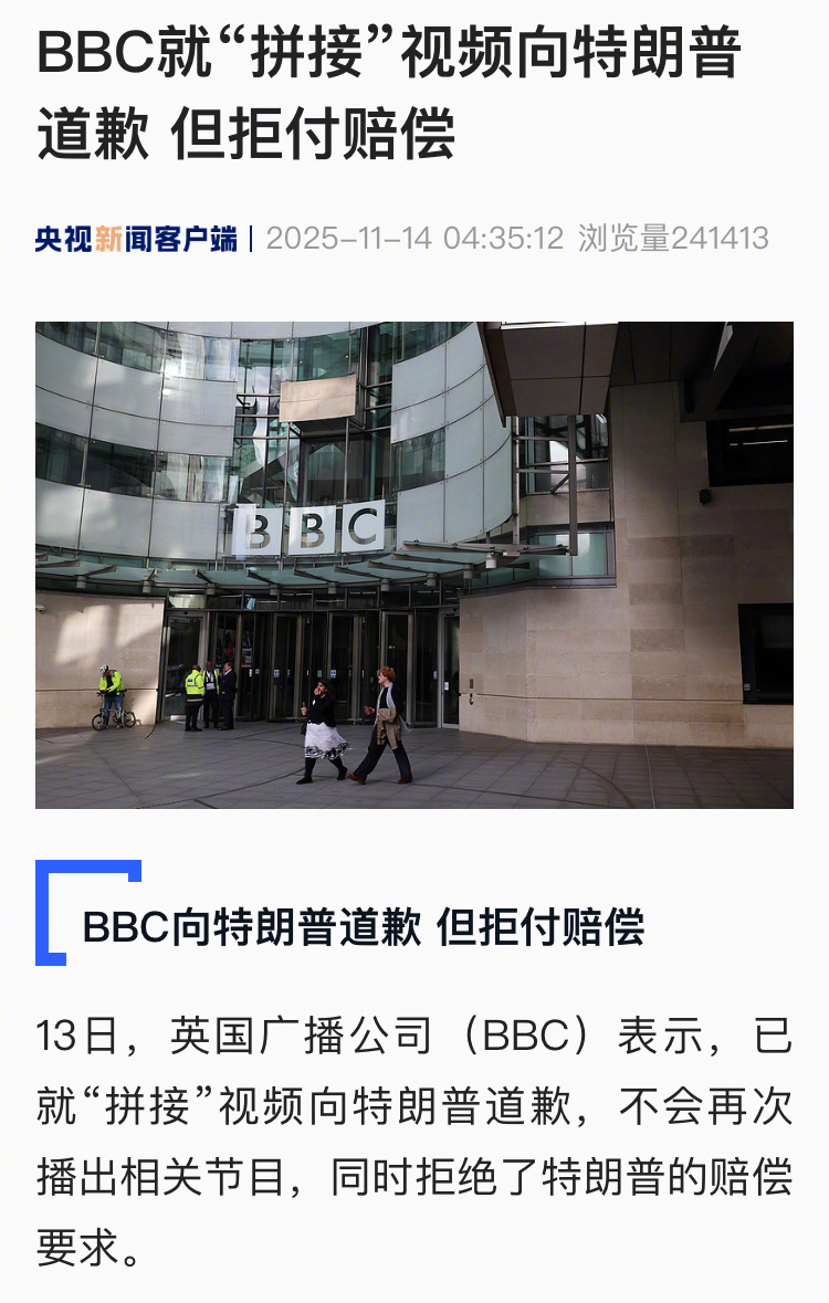 【BBC就“拼接”视频向特朗普道歉 但拒付赔偿】13日,英国广播公司(BBC)表示,已就“拼接”视频向特朗普道歉,不会再次播出相关节目,同时拒绝了特朗普的赔偿要求。BBC发言人表示,英国广播公司董事长萨米尔·沙赫已单独致信白宫,就此事进行道歉,但不接受因此受到诽谤诉讼。特朗普律师团队曾表示,如果英国广播公司不撤回节目、道歉并给予赔偿,将对其进行起诉,要求10亿美元的损失赔偿。(央视新闻)