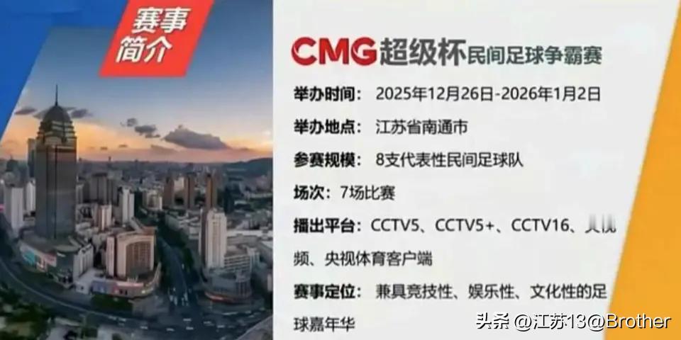 跨年之际,南通作为东道主,主场迎接七省冠军的挑战! 虽然在点球大战中,最终输给泰州,无缘苏超冠军。但南通还是在下个月月底,迎来了一次为自己正名的好机会。 昨天晚上传出的消息,下个月26号,央视会组织一个民间足球争霸赛,一共就8支球队参赛,主要就是七省的足球联赛冠军,外加东道主南通。 代表江苏的是泰州,还有最近非常火爆的赣超冠军,江西赣州等等。南通能够有资格去承办这样的赛事,还是非常的令人骄傲的。 今年的苏超联赛,也让所有人都见识到了南通队的韧劲和实力。自己的青训之路,我相信最终也会得以坚持。南通的这帮小伙子,未来还会迎来属于他们的时刻。 当然了,这次8支队伍中,江苏同时拥有泰州和南通。我相信这一次大概率会将这座冠军奖杯留在江苏吧 。 但具体的赛事规程和规则,目前似乎还没有披露,让我们保持期待吧。