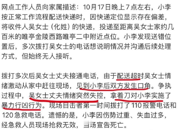 冲动真是魔鬼,仅仅是因为快递员送错快递,将对方刺伤身亡,直接毁了两个家庭。 整个事件的起因仅仅是快定位系统偏差,快递员误将包裹投递至距吴女士家约500米外的点位。 发现错误后,他连续5次以上致电吴女士未接通,最终由其丈夫接听。因“配送超时”,吴女士情绪激动,与丈夫一同赶往现场。 双方发生口角后,吴女士丈夫突然持刀行凶,致小李失血过多,经现场抢救无效当场死亡。 目前,行凶者已经被控制,因涉嫌故意杀人罪,司法实践类似案件多判死刑或无期徒刑,情绪失控不构成免责理由。除了刑事部分,民事赔偿自然也是不会少的。 一个年轻生命无辜逝去的悲剧;是一个家庭失去顶梁柱的悲剧;是行凶者因一时冲动而毁掉两个家庭的悲剧。 在快节奏、高压力的社会中,部分人的情绪调节能力脆弱,容易因小事而瞬间引爆极端情绪,缺乏通过理性、非暴力方式解决问题的能力。可这些人有承担后果的能力吗? 这类人,对他人的苦难和生命缺乏基本的共情和敬畏,将服务提供者视为可以随意发泄情绪的“工具人”,实在可悲。 仅仅是一个快递,何至于此。在收到送错的快递时,一个电话、一句“没关系,你再过来换一下就好”的宽容,远比任何凶器都更有力量。