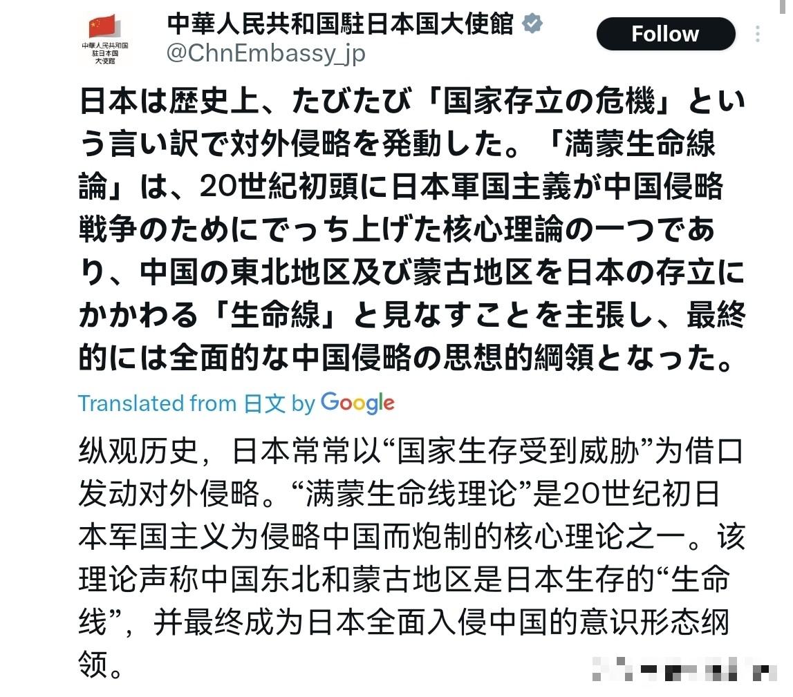 日本算盘完全打错了! 高市早苗已经选择闭嘴,但没想到我们驻日大使馆继续揭日本的老底子,高市早苗现在完全下不来台了!11月13日,我们驻日大使馆刊文称,日本历史上多次以“国家存在危机”为借口发动对外侵略,“满蒙生命线论”是20世纪初日本军国主义为侵华战争炮制的核心理论之一。 高市早苗从右翼代表阵营杀出,以为能借着民族情绪拉拢支持,但没料到各路批评接连不断。 鸠山由纪夫、野田佳彦这些政坛老将都看不下去,纷纷表态反对,认为继续拿这样的说法炒作,只会让日本陷进历史的泥淖。 高市面对这样的场面干脆选择沉默,但舆论的箭头并没有因此转向别处,反而让越来越多日本人看清了右翼势力对历史问题的轻率。 社会上有不少人并不认同高市那一套,他们知道这种用“危机”做理由的说法几十年前已经把日本拖进苦难。 更何况中国这次言辞强硬,完全没有打算让话题模糊下去,专门用日语写,就是为了让每个普通日本人都能读到、都能细细琢磨。 这不是单纯的口水战,而是一次赤裸裸的警示。这样的争议明摆着不仅是两个国家的交锋,更直指日本社会要不要再往历史的旧坑里跳。 高市之流的说法,说白了就是借历史外衣混淆视听,但历史的账本清清楚楚摆在那里,每一次重提都让人倒吸一口凉气。 而日本政坛内部的分歧也很明显,一边是顾及国际形象和历史责任感的成年人,一边是还想借民族主义情绪炒作的右翼代表。 高市本以为强硬的态度能得到更多的支持,没想到反倒是自己成了孤家寡人。她的算盘没打对,中国的回应比她想象得要直接得多。这一局,谁更高明一目了然。 其实每次日本社会出现类似的历史言论,都会令邻国警觉,日本民间也会重新翻看那些过去付出的沉重代价。 日本因为这种“生死存亡”的借口结果弄得家破国亡,血的教训早已敲响警钟。今天如果还有人不以为然,那只能说,他们对历史的敬畏和对现实的责任心都远远不够。 中国大使馆的强硬做法说明面对历史问题,糊弄和试探都是在玩火。日本要想走得更稳,还是要敢于正视和反思历史,远离那些已经证明是错误的路子。 说到底,谁要是怀抱侥幸心理,一撩就想点燃民族情绪,后果只会让自己下不了台。日本政坛、民间都得想明白一个道理:历史责任逃不掉,该面对的时候绝不能选择沉默。