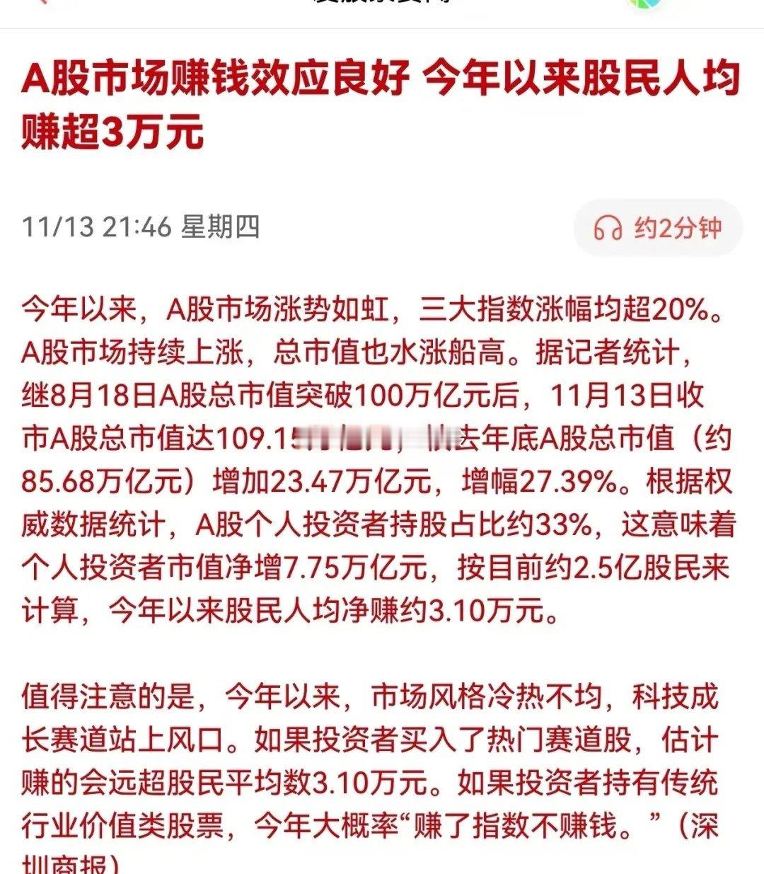 今年以来,A股市场涨势如虹,三大指数涨幅均超20%。根据权威数据统计,A股个人投资者持股占比约33%,这意味着个人投资者市值净增7.75万亿元,按目前约2.5亿股民来计算,今年以来股民人均净赚约3.10万元。其实我自己认为,今年拿得住的都赚钱,大部分的金融消费者由于本金少,没有想象的那么多,还有部分还在回本的路上,有些还在回21年的本,反正股市就是隔几年套一批,再放一批。这些数据好比股市里10个人里9个都在亏钱!只有一个赚1000万!一平均结果大家人均赚100万。