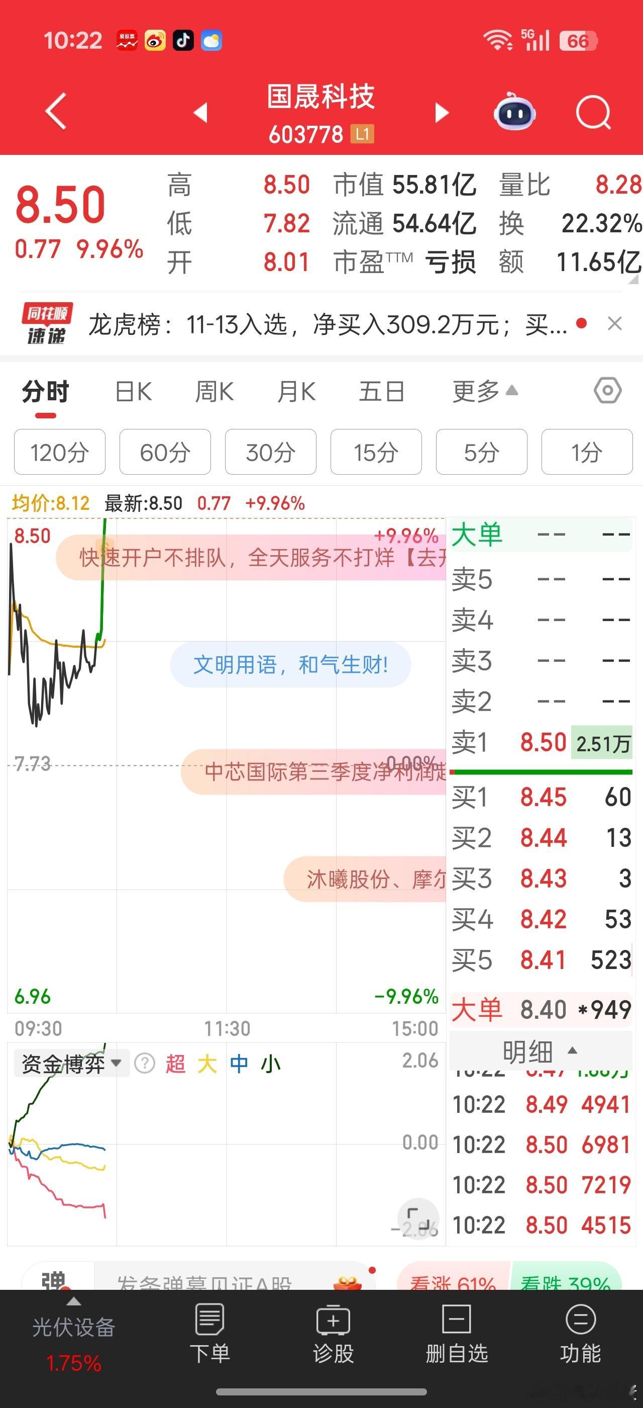 其他高标不倒,国晟主力也麻溜的回去。吗我们继续抱团但是我觉得今天断板比继续连板好。。提前避一下监管风头。下周等其他高标躺了再上位带领光伏冲。。。
