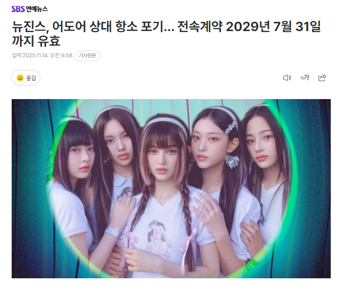 NewJeans放弃对ADOR的上诉,专属合约有效期至2029年7月31日14日据法律界和歌谣界透露,NewJeans 5名成员在上诉期限13日午夜(14日0时)之前没有提交上诉状。上个月30日,首尔中央地方法院民事合议41部在ADOR以NewJeans的5名成员为对象提起的专属合约有效确认诉讼的宣判日中,判决“ADOR和NewJeans之间签订的专属合约有效”。一审败诉后,NewJeans成员们曾通过法律代理人表示“将上诉”,但实际上并没有上诉。NewJeans和ADOR的专属合约有效期至2029年7月31日。