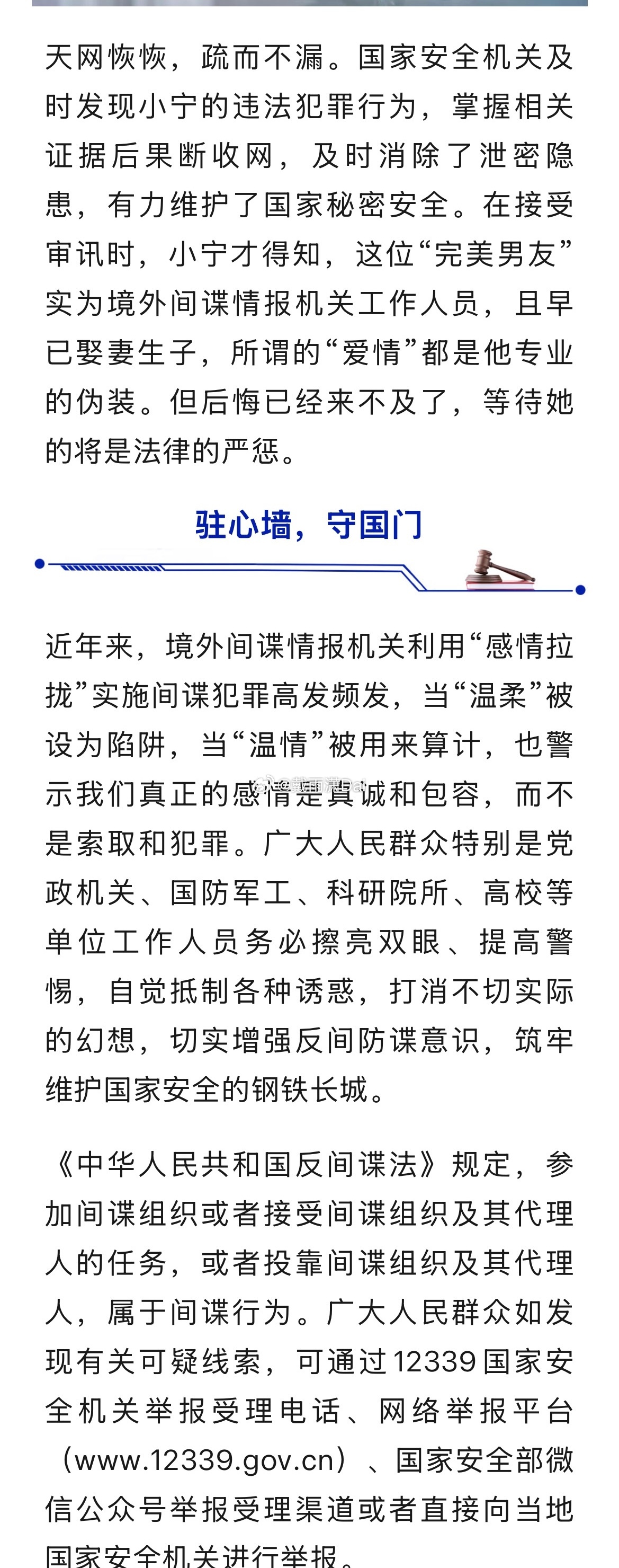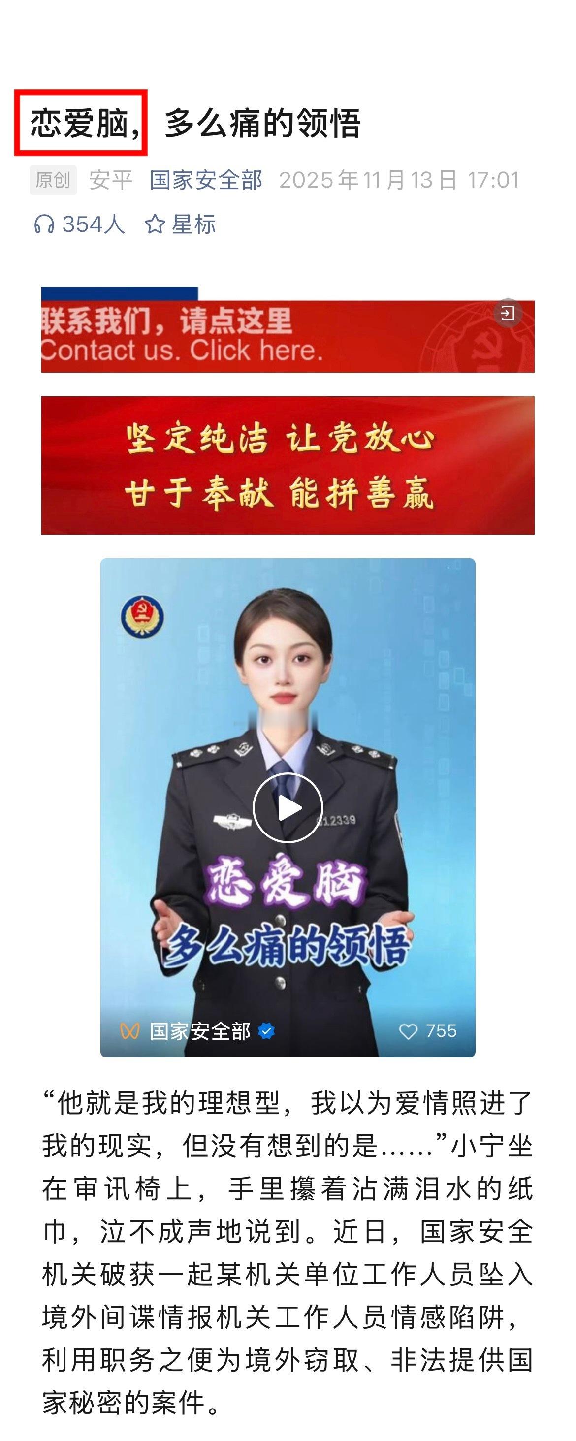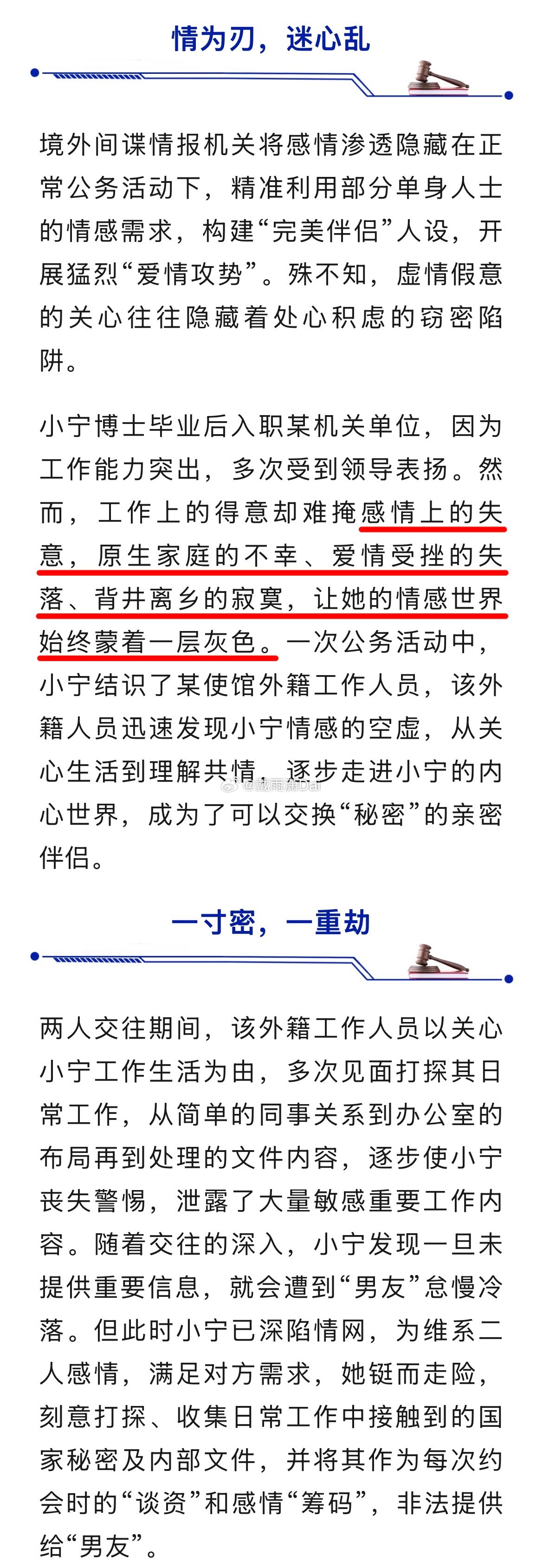 这篇通稿我读着非常不舒服。首先标题把整件事概括成「恋爱脑」就非常不合适。恋爱脑这个词一般用来形容过度重视爱情,以至于忽视工作和其他事情的人。在实际网络语境里经常被反婚反育的女权分子用来嘲讽愿意为另一半付出的正常女人。本案的当事人都博士毕业了,在重点部门上班,报道说她「工作能力突出,多次受到领导表扬」。然而就是这样的人,明知自己工作涉密,还去跟别国使馆人员发展恋爱关系,并且多次收集并泄露国家机密。整件事根本不是什么青春期的懵懂少女一时冲动,而是一个年纪不小的事业女性在权衡利弊之后主动做出的媚外卖国选择。我觉得标题应该改成《食洋肠,多么痛的领悟》。通稿里更离谱的是这段:「原生家庭的不幸、爱情受挫的失落、背井离乡的寂寞,让她的情感世界始终蒙看一层灰色。」一个受过高等教育的成年人主动去当汉奸,现在被抓了却甩锅所谓「原生家庭」,这不就典型的女权推卸责任的话术吗?扯什么的「爱情受挫」、「背井离乡」更是无稽之谈。谁还没失过恋了?现在离家去外地读书工作的人少吗?这些个人因素能是当汉奸的借口吗?通稿的任务是宣传反间谍意识,警告老百姓不要违反《反间谍法》,而不是替犯罪分子粉饰动机、合理化其犯罪行为。文章里加上这些莫名其妙的心理背景描写很难不让人怀疑是在为后续的从轻发落做铺垫。这种文风的稿子我用膝盖想也知道是什么类型的人写出来的。