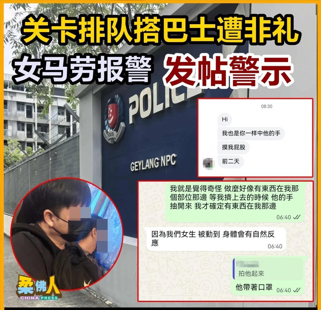 口罩男趁上巴士 伸咸猪手非礼女生! (新山13日讯)女马劳清晨排队挤巴士越堤工作,遭“口罩男”趁乱伸出咸猪手非礼,女子心有不甘除了发帖警惕其他女性乘客,也前往警局报案处理。 这起事件于今日清晨6时30分至6时45分左右,在新山苏丹依斯干达大厦关卡处发生。 女事主郑歆颐接受《中国报》访问时阐述,她今日如往常在新山关卡排队准备乘搭公共巴士,前往新加坡工作。 她指出,她今日是穿的是比较厚装连身裙和塑身打底裤,被人摸的当下,是有感觉到有东西在其下体,但不确定是什么。 “直到我被推挤到巴士门口,发现一名戴着口罩男子的手抽出来,我才恍然发现被侵犯,因为那个手抽出来的感觉最明显,但我已经被挤到巴士门口,便直接上巴士了,同时对方也跟着上巴士。 她指出,对方没有伸入裙子,就是隔着其裙子手在摸其下体。她相信该男子也是在新加坡工作,她也一路跟着对方到新加坡兀兰关卡,看到对方扫描护照入境新加坡。 “我本来想追上去和叫新加坡警察帮忙,但是因为我一个人感到太害怕就止步了。” 但她不想吃闷亏也不希望其他女子也受害,因此在面子书发帖提醒,没想到是的有一位女生私讯她,前两天也是被同个男子摸屁股。 中国报柔佛人 中国报 小心陌生人 女生要注意安全