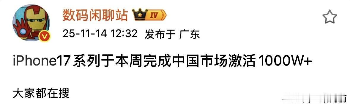 站哥爆料:iPhone17系列于本周完成中国市场激活1000W+ 这销量简直是开了挂,要知道距离开售才两个月左右,平均每天卖出近2万台,高端手机市场这波真被苹果垄断了! 最让人意外的是“越贵越香”的魔幻场面——Pro Max机型直接断层领先,激活量快冲到400万台,占了整个系列近4成份额!9999元的起售价不仅没劝退消费者,反而成了很多人的首选,甚至线下门店还出现了小幅加价、排队拿货的情况。反观同价位安卓旗舰,小米14 Ultra、华为Mate70系列同期激活量连它的零头都不到,差距直接拉满。