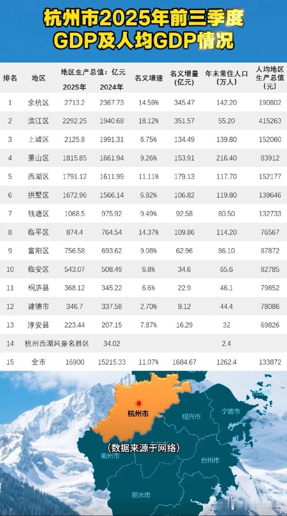 杭州市2025年前三季度各区县市GDP以及人均GDP数据水平情况,余杭区与滨江区前三季度经济增量最高,余杭区滨江区前三季度经济增量都达到了300亿元人民币以上的水平。