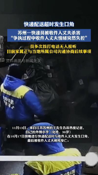 惊魂!苏州30岁快递员送错包裹遭刺身亡!一次失误,两条人生尽毁…… 傍晚七点的苏州工业园区,30岁的快递员小李正派送当天最后一趟件。因定位偏差,他将吴女士的包裹误投至数百米外的唯亭二中附近,这个无心之失,竟成了他生命的终点。 发现送错后,小李反复拨打吴女士电话致歉协商,却始终无人接听。直到电话接通,另一端是怒气冲冲的吴女士丈夫——快递已超时,夫妻俩带着不满赶往现场。本是几句就能说清的误会,见面后却迅速升级为激烈争执。没人预料到,吴女士丈夫突然情绪失控,持刀刺向小李。虽有路人紧急报警呼救,但小李因失血过多,当场抢救无效离世。 据悉,小李是中国邮政正式员工,负责该片区投递工作。事发于10月17日,直至11月中旬才被媒体曝光。目前其家属正与快递网点沟通后续事宜,警方及网点暂未披露更多细节。 这并非个例:2023年无锡送货员争执被刺身亡,同年保安因禁止快递员进小区持刀杀人,2021年南京外卖骑手因差评引发命案。一次快递失误、一句口角、一个差评,都可能成为悲剧的导火索。 根据我国法律,故意杀人罪最高可判死刑,冲动之下的恶行终将付出法律代价。 一条年轻的生命戛然而止,两个家庭陷入绝境。你怎么看待这场因小事引发的悲剧?遇到配送失误时,你会如何处理?快递纠纷引命案 遇事别冲动