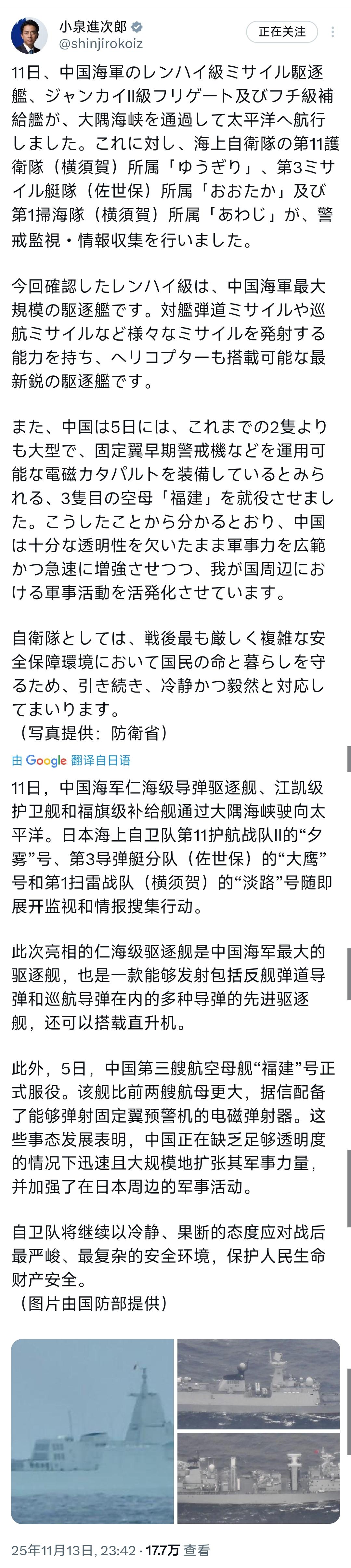 日本防卫大臣小泉进次郎在社交平台上披露了中国海军最新一次太平洋行动的细节,说是11日穿越大隅海峡的中国军舰阵容不小。 仁海级驱逐舰领头,后面还有江凯II级护卫舰和福池级补给舰,三艘舰艇配合着就这么开进了西太平洋。这下日本可不敢掉以轻心,马上派出了三艘船分别从横须贺和佐世保基地出动。 盯紧了中国海军的一举一动。看上去像是一次普通的例行穿越行动,但细细想想,背后的含义可比海峡的水深得多。 先说说这次的主角之一,中国的仁海级导弹驱逐舰。这可不是普通的驱逐舰,外形上跟中国之前的055型差不多,是目前中国海军吨位最大的一类水面舰艇。 光是舰体就足够吓人,关键是它能发射的可不是一般的导弹,反舰弹道导弹和巡航导弹全都能搞定。再加上能携带直升机,这种舰艇的任务边界已经远远超出了传统意义上的海上护航。 换句话说,它不仅能打还能看,还能控制信息流动,在现代信息化战争中,这种舰艇简直就是水面上的多面手。 日本方面这次出动的舰艇虽然不如仁海级那么抢眼,但也不是吃素的。像是“夕雾”号护卫舰,虽然服役时间不算新,但在情报监视和反潜任务上还是有两把刷子的; “大鹰”号导弹艇灵活小巧,适合近海快速反应;“淡路”号扫雷艇则说明日本这次不仅盯着大型舰艇的行动轨迹,也考虑到是否存在水下布雷或其他海上战术手段的可能性。 日本这套组合拳看起来更像是一次标准化的战术配合,侧重点不是硬碰硬,而是全方位掌握对方动态。这次穿越的时间点也挺有意思的,刚好卡在福建舰正式入列之后几天。 福建舰作为中国的第三艘航母,一上场就是焦点。这艘航母的亮点不光是吨位大,更关键的是首次搭载了电磁弹射系统,这意味着中国航母终于可以搭载固定翼预警机了。 这类飞机在海上作战中的信息中枢作用不容小觑。日本对于福建舰的关注早就不是一天两天了,福建舰的出现,使得中国海军在远洋作战的体系完整度上迈出了一大步。 过去大家都说中国航母打击群少了空中预警这一环,现在这环补上了,那么战略投送范围、作战指挥效率和空域监控能力都会有质的提升。 从这次穿越事件本身来看,其实在国际法上没有问题,大隅海峡是国际通道,中国军舰的行动是合法的。但问题是,合法并不等于让人放心。 对日本来说,中国军舰频繁在其周边海域出现,哪怕没有直接威胁,也会被视为战略压力。而对于中国来说,这种穿越其实是在表明一种能力。 一种“我能来,而且我随时可以来”的态度。这种态度在军事上叫做存在感,在战略博弈中叫做威慑力。如果把这次事件拿来和南海的局势对比,就会发现一个有趣的趋势。 南海是中国的家门口,西太平洋则是中国走出去的起点。以前大家说中国海军“近岸强,远洋弱”,但最近这几年,从反海盗到远海训练。 再到战舰批量下水,中国海军的脚步是一点点往外拓的。而这次仁海级等舰艇开进太平洋不仅是一次训练,更是一次展示。展示的不只是舰艇的性能,更是整个海军体系的自信。 再说回来,日本的这种应对,其实也反映出一个现实,那就是东亚海域的安全格局正在变得比以往更复杂。中国的海军能力在增长,日本的警戒力度也在同步增加。 这种你来我往的局面,虽然表面上是“监视”与“应对”,但实质上是一场战略层面的博弈,谁能够保持常态化的存在,谁就能在区域安全话语权上占据更多主动。 很多人看到新闻会以为这就是一次普通的穿越,其实背后的信号远不止表面这么简单。中国在通过一次次实际行动,验证自己的海军装备是否靠得住。 同时也在用这种行动告诉周边国家,中国的海军不是“看得见、打不远”的样子货,而是真正在具备远洋作战能力。而日本的反应,也说明他们对这一点心知肚明。 未来类似的穿越肯定还会有,而且可能走得更远,舰艇的种类也会更丰富。对中国来说,这是新阶段的开始,对日本来说,是战略心态的一次调整。 海上的故事看起来静悄悄,实则每一步都在翻涌风浪。