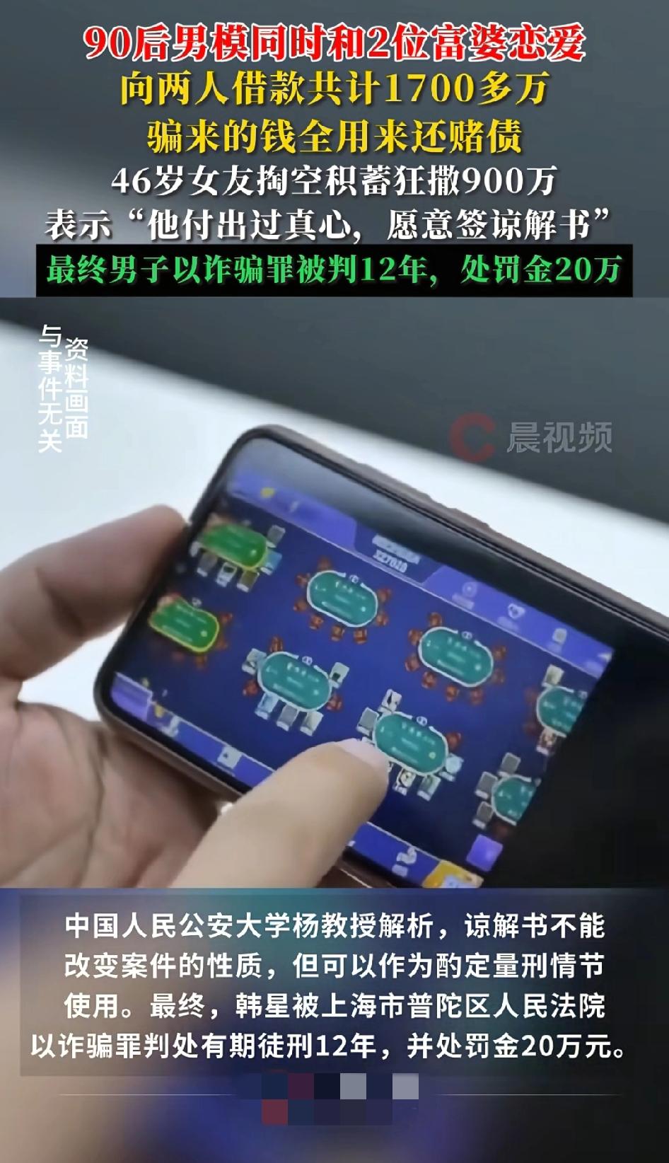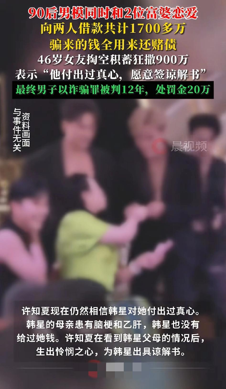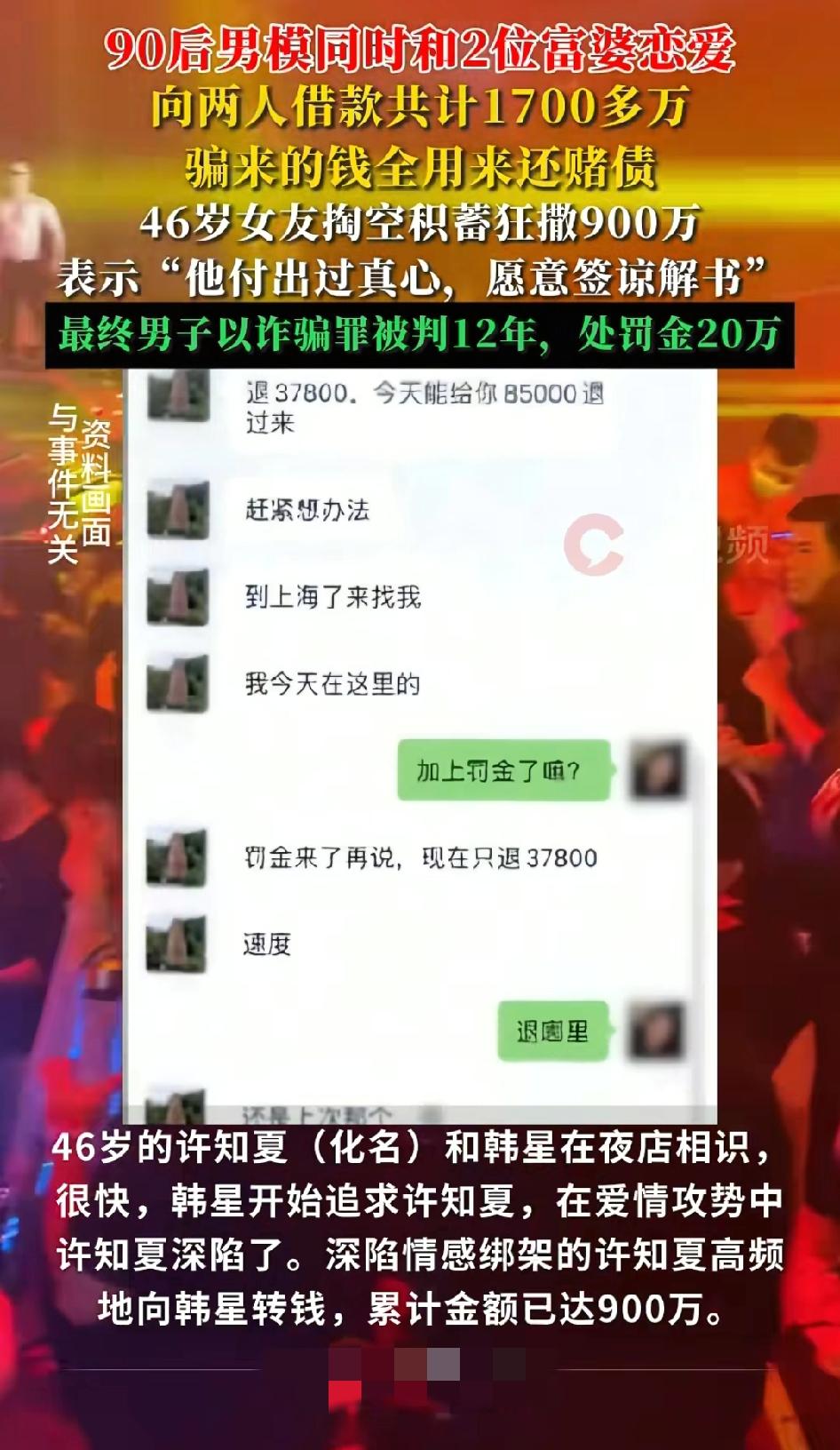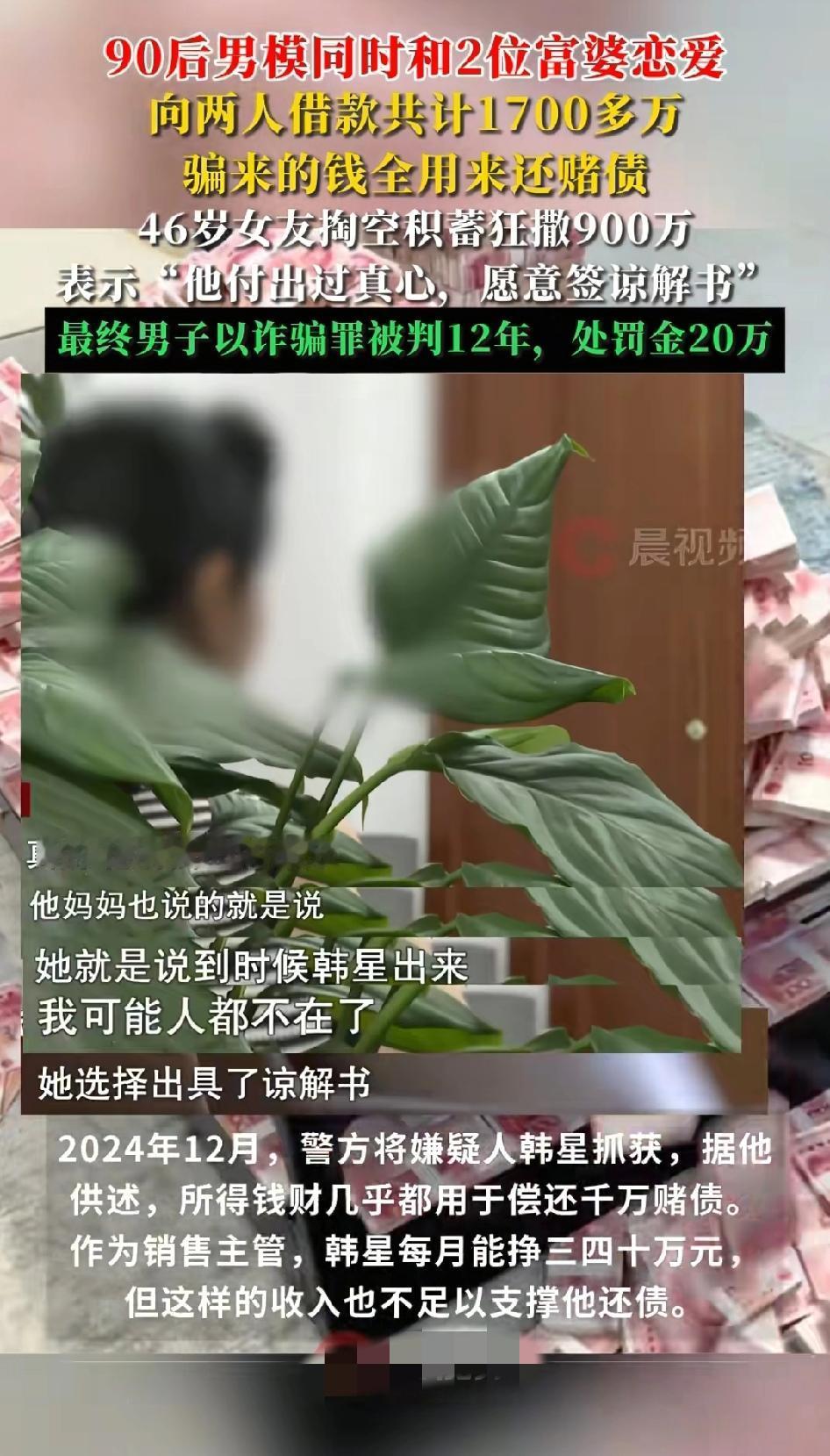 “太让人不可思议了! ”上海,一名90后的男模同时与两名富婆交往 ,以各种理由骗取两名富婆上千万元。 男子以母亲生病、冻结银行卡等理由骗取富婆上千万元 ,用这些钱全部还了赌债 。 其中一名46岁的女性 ,坚信曾经“付出过真心”,签了谅解书 。男子也因诈骗罪被判处有期徒刑12年 ,并处罚金20万元 。 此事引起网友们热议,有网友说:“富婆的钱真的这么好骗吗,为啥我找的都是想骗我的。” 其实,我们就应该脚踏实地的工作 ,恋爱可以踏踏实实的找个人,不要存有侥幸心理 。最后伤害了别人,也把自己害了 。 青春就那么几年,挥霍光了将后悔不已 。要在年轻的时候犯下错误,老了后悔莫及 。不要总想着不劳而获 。 (信息来源:闪电新闻 )