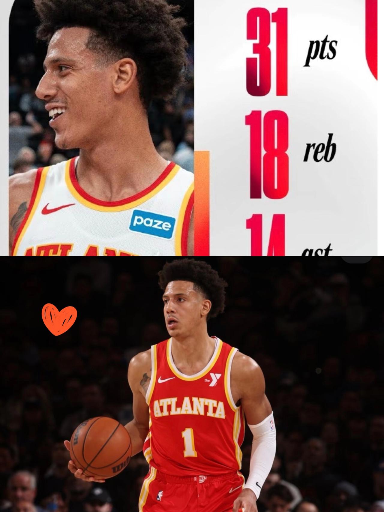 家人们快看疯了!1.5亿合同居然打出 白菜价的性价比,杰伦·约翰逊这波 31分18板14助7断的准四双神级操作, 直接把NBA纪录册捅出个窟窿! 谁能想到特雷杨缺席,老鹰反而炸出个 全能战神?要知道这数据放在历史上 都罕见,攻防两端一把抓,既能抢板 又能助攻还能抢断,硬生生带着 全民皆兵的老鹰,在客场顶住了 马尔卡宁40分的狂轰滥炸。 其实NBA最香的从来不是顶薪巨星 单核,而是这种被低估的“宝藏球员”, 拿着看似溢价的合同, 却在关键时候扛起全队, 这哪是花钱买球员,分明是捡了个 冠军拼图级别的大腿! 奥孔古32分+克雷伊奇6记三分的加持, 更证明老鹰早已不是“特雷杨一人队”。 你们觉得约翰逊这波表现能锁定全明星席位吗?还是说他会成为老鹰未来的新核心?评论区来聊聊你的看法~