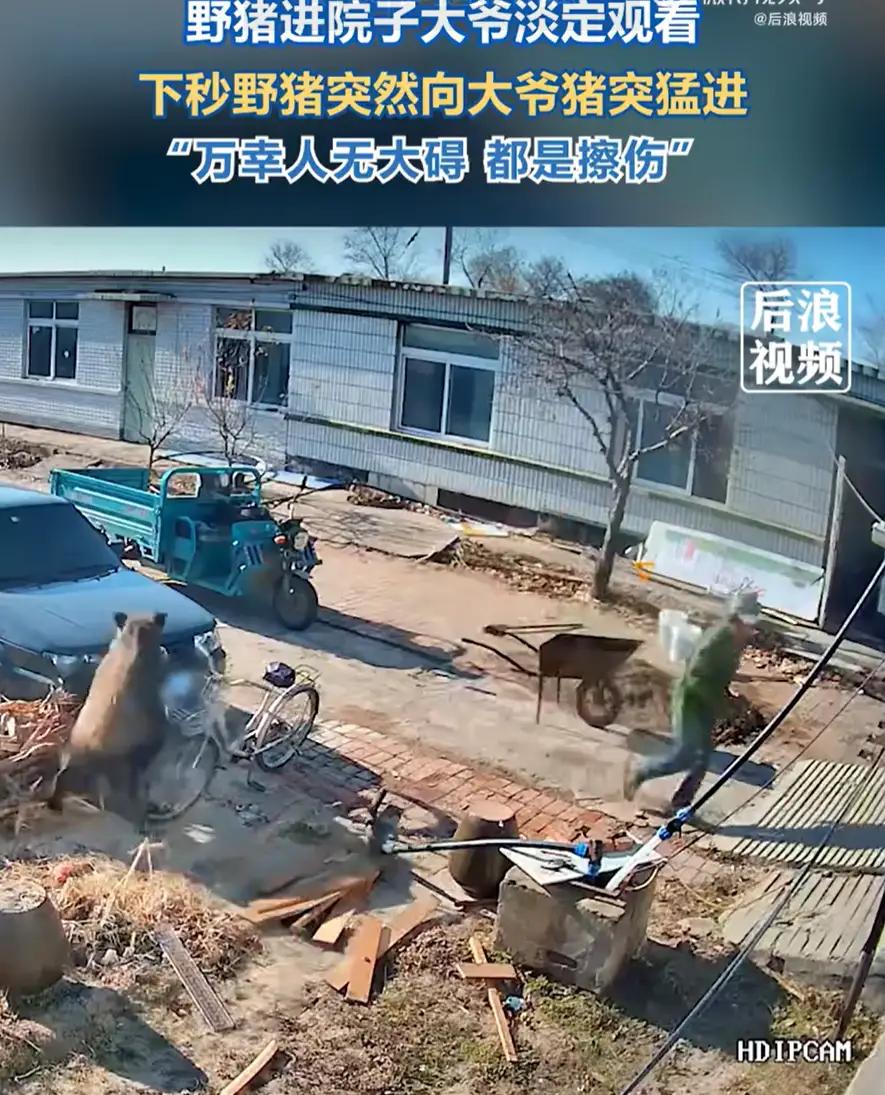 辽宁,一大爷在家里听到院子有动静,出来一看发现是一只大野猪,可大爷不但没有害怕闪躲,反倒是站在原地观察起野猪,结果下一秒就被野猪给撞了,好在没有大碍,只是擦伤。网友:这真是无知者无畏! 当时,大爷正在家中休息时,突然听到院子里传来一阵急促的异响,像是重物拖拽摩擦地面的声音。大爷没有多想,便起身走出房门,想要一探究竟。 走到院子,大爷愣在原地,院子中一头体型壮硕的大野猪,浑身鬃毛粗硬,四肢粗壮有力,正低头在院子里拱着什么。面对这罕见的不速之客,大爷非但没有露出丝毫惧怕,也没有转身闪躲,反而站在原地饶有兴致地观察起来,想要看看这头野猪究竟想做什么。 可就在大爷驻足观察的下一秒,意外突然发生。野猪猛地抬起头,朝着大爷的方向猛地冲了过来。由于距离过近,大爷根本来不及反应,便被野猪狠狠撞中腿部,瞬间失去平衡摔倒在地。 幸运的是,野猪并未继续攻击,撞人后便转身窜出院子,消失在附近的树林中。大爷缓过神后,发现自己只是腿部和手臂有些轻微擦伤,并无大碍,只是刚才的撞击让他心有余悸。 网友:“这真是典型的无知者无畏啊!”“野猪可是野生动物,攻击性极强,大爷胆子也太大了”“还好只是擦伤,要是被獠牙伤到可就危险了”。也有网友提醒,遇到野猪等野生动物时,切勿近距离观察或挑衅,应第一时间远离并寻求帮助,避免发生意外。