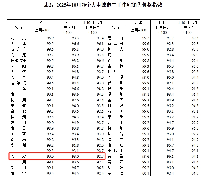 在这一宏观背景下,长沙作为二线城市的代表,房地产市场同样出现降温信号。根据国家统计局数据,10月份二线城市新建商品住宅销售价格环比下降0.4%,二手住宅销售价格环比下降0.6%。