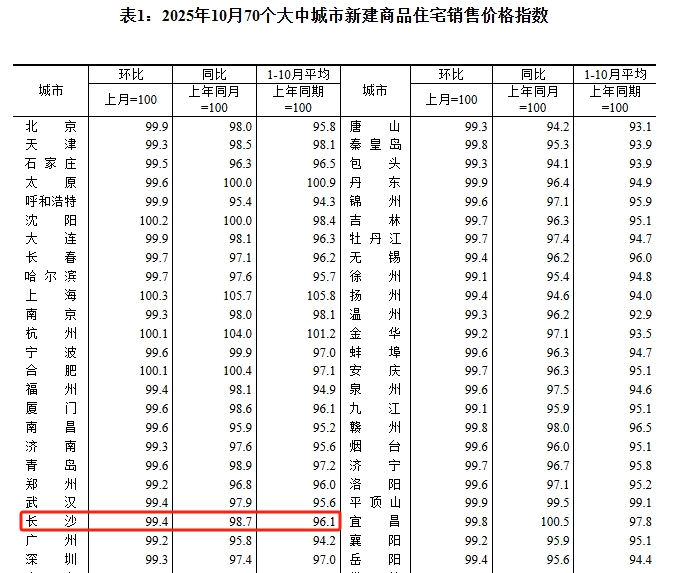国家统计局今日发布的数据显示,2025年10月,全国70个大中城市商品住宅销售价格环比、同比均呈下降趋势。