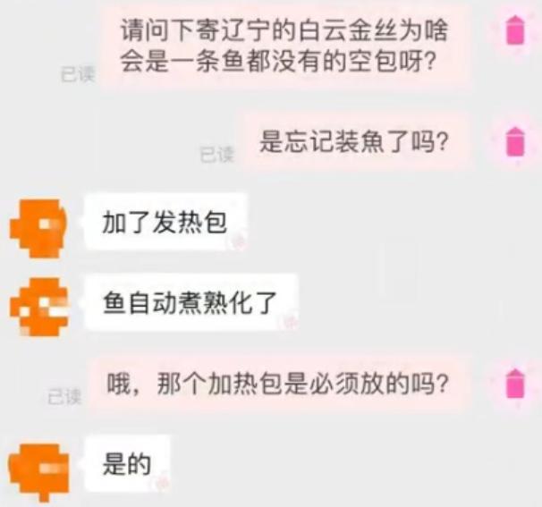 在网上买了50条观赏鱼,但商家怕鱼冻死,就在水里放了加热包,结果把鱼都煮熟了,再加上快递一路摇晃,直接把鱼肉摇分解了,最后成功收到了一包“浑水”。 不放加热包吧,鱼会冻死,放加热包吧,鱼会热死,难搞哦。