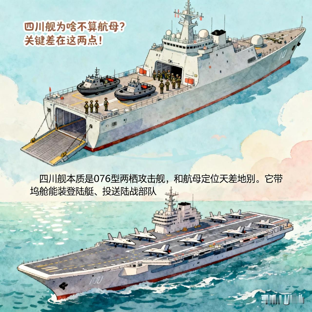 四川舰为啥不算航母?关键差在这两点! 四川舰本质是076型两栖攻击舰,和航母定位天差地别。它带坞舱能装登陆艇、投送陆战部队,核心任务是两栖登陆;而航母无坞舱,专攻制空制海,靠多型固定翼舰载机构建打击网。电磁弹射只是辅助,任务不同决定它成不了航母!四川舰