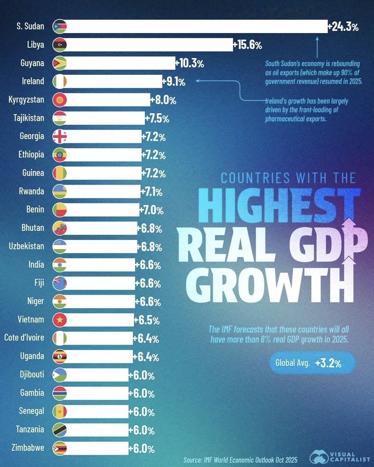 2025全球经济增速榜单揭晓!南苏丹以15.6%的增速一马当先,利比亚、圭亚那紧紧跟随。爱尔兰成为唯一上榜的发达国家,印度也以6.4%的增速稳健前行。石油出口、药品提前发货助力多国经济腾飞🌍🚀 全球平均增速仅3.2%,你所关注的市场跑赢了吗?