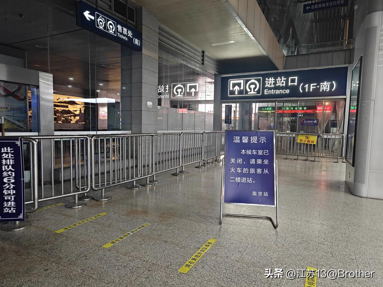 南京站,南广场一楼候车厅关门了?以后都要走2楼? 之前,宁启铁路上的动车,都是从南京站南广场一楼候车厅进去的。包括去往扬州、泰州、江都、海安、南通等方向的动车。 但是今天赶过去乘火车的时候,照例是出了地铁,去了南广场。但走到熟悉的候车厅时,发现南广场一楼候车厅居然连灯都没有开! 门口摆着一架不算太明显指示标语,上面只是简单地写着,原先在一楼候车的班次,全部都要改到2楼候车大厅,一楼的候车室暂时停用了。 大部分人明显都是没有任何思想准备的,都是从一楼然后行色匆匆赶往二楼。幸好今天预留的时间足够的多,因为二楼排队的人太多了,进站没那么快。 就是不知道今天是临时关门了,还是以后永远都不能走南广场一楼上车了?如果真是这样的话,下次还不如是从北广场出发呢。 提醒一下大家,以后去南通、扬州和泰州的,还是要多预留几分钟啊。