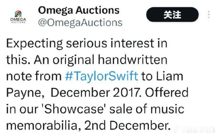 据外网,霉霉Taylor Swift在2017年12月给One Direction已故前成员Liam的手写信被曝光,并将于12月2日被拍卖。