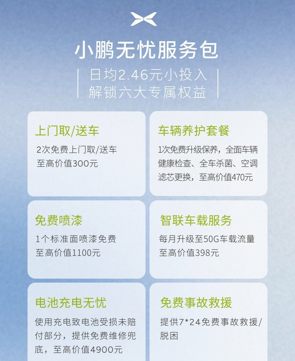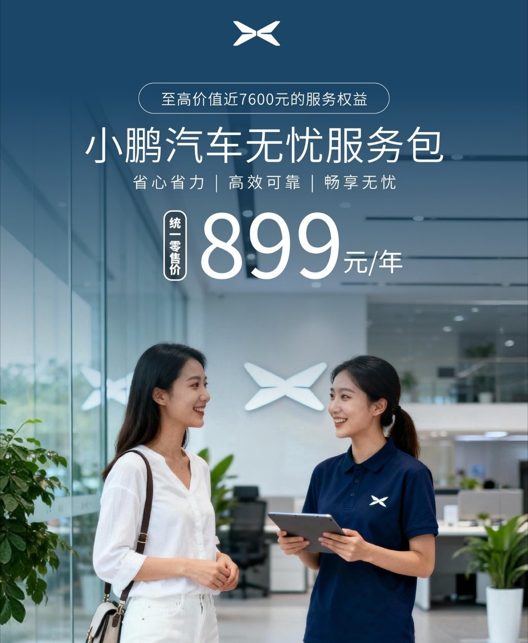 【899 元 / 年:小鹏汽车“无忧服务包”上线,上门取 / 送车、保养、喷漆、事故救援】小鹏汽车“无忧服务包”于上线,售价 899 元 / 年,可享价值 7600 元六大服务权益包:上门取 / 送车:2 次免费上门取 / 送车,至高价值 300 元(仅限同城)车辆养护套餐:1 次免费升级保养,全面车辆健康检查、全车杀菌、空调滤芯更换,至高价值 470 元免费喷漆:1 个标准面喷漆免费,至高价值 1100 元(不包含拆装、钣金和标定工序的施工工时费)智联车载服务:每月升级至 50G 车载流量,至高价值 398 元电池充电无忧:使用充电致电池受损未赔付部分,提供免费维修兜底,至高价值 4900 元免费事故救援:提供 7*24 免费事故救援 / 脱困购买条件:在小鹏官方渠道完成车险购买,投保日次日起至商业险保单生效后的 30 天内可购买服务包