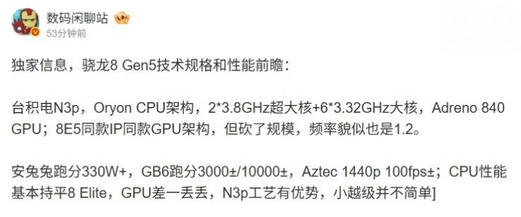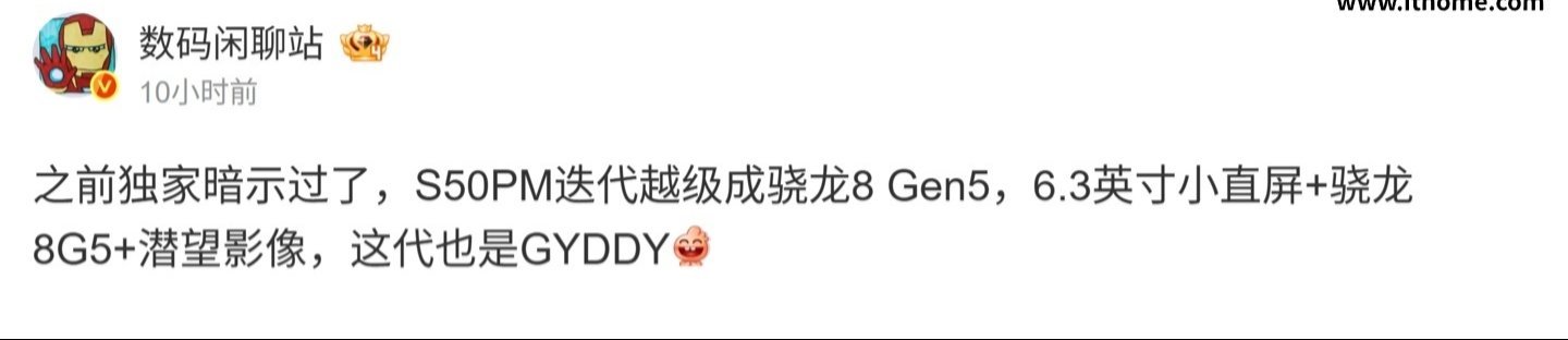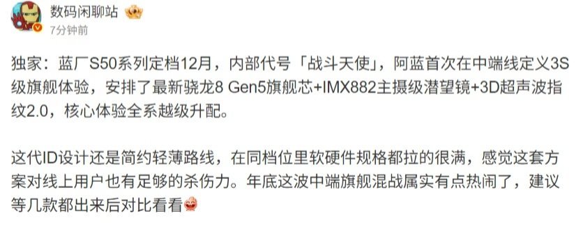 【消息称 vivo S50 系列手机定档 12 月:首次全系越级升配,骁龙 8 Gen5 旗舰芯 +IMX882 主摄级潜望镜 +3D 超声波指纹 2.0】博主 数码闲聊站爆料称,蓝厂 S50 系列定档 12 月,内部代号「战斗天使」,阿蓝首次在中端线定义 3S 级旗舰体验,安排了最新骁龙 8 Gen5 旗舰芯 +IMX882 主摄级潜望镜 +3D 超声波指纹 2.0,核心体验全系越级升配。爆料还称,这代 ID 设计还是简约轻薄路线,在同档位里软硬件规格都拉的很满,感觉这套方案对线上用户也有足够的杀伤力。年底这波中端旗舰混战属实有点热闹了,建议等几款都出来后对比看看。11 月 5 日,一款型号为 V2528A 的 vivo 新机昨日通过了 3C 认证,支持 90W 快充,该博主爆料称是 vivo S50 系列手机。据爆料,vivo S50 是双尺寸 6.59 英寸 + 6.31 英寸,PM(预计是 Pro mini)处理器是骁龙 8 Gen5,全系潜望影像 + 外围增强,镜头 ID 设计改成了更主流的方案。此外,博主曾爆料某厂的 6.3 英寸小直屏迭代机型将有“越级升级”,被外界认为是 vivo S50 Pro mini。爆料显示,骁龙 8 Gen5 芯片将采用 Oryon CPU 架构,拥有 2*3.8GHz 超大核 + 6*3.32GHz 大核,配备 Adreno 840 GPU,是第五代骁龙 8 至尊版同款架构,但规模被砍,频率“貌似也是 1.2”。高通在骁龙峰会 2025 上宣布,骁龙 8 Gen5 处理器回归,将由一加、vivo、iQOO、motorola、魅族新机搭载。