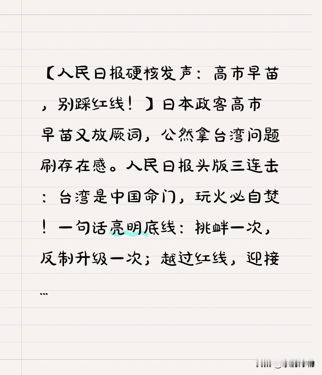【人民日报硬核发声:高市早苗,别踩红线!】 日本政客高市早苗又放厥词,公然拿台湾问题刷存在感。人民日报头版三连击:台湾是中国命门,玩火必自焚! 一句话亮明底线:挑衅一次,反制升级一次;越过红线,迎接她的不是热搜,而是东海的实弹演习。 网友神补刀:“嘴炮不如炮弹,继续跳,下一艘海警船就贴脸航行。” 年底了,别拿选情赌国运,中国统一的车轮不会为任何人减速。 想红?先想想后果。评论区+1,一起送高市“出道即巅峰”。 高市早苗内阁 高木早苗 高世早苗 高市早苗演技派 山本早苗 早苗经济学 高田早苗
