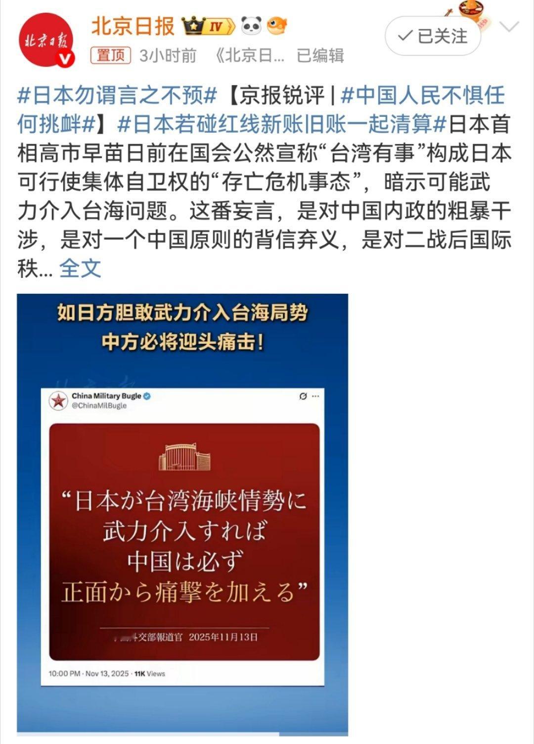 日本首相高市早苗公然发表涉台挑衅言论,暗示武力介入台海,此举粗暴干涉中国内政,严