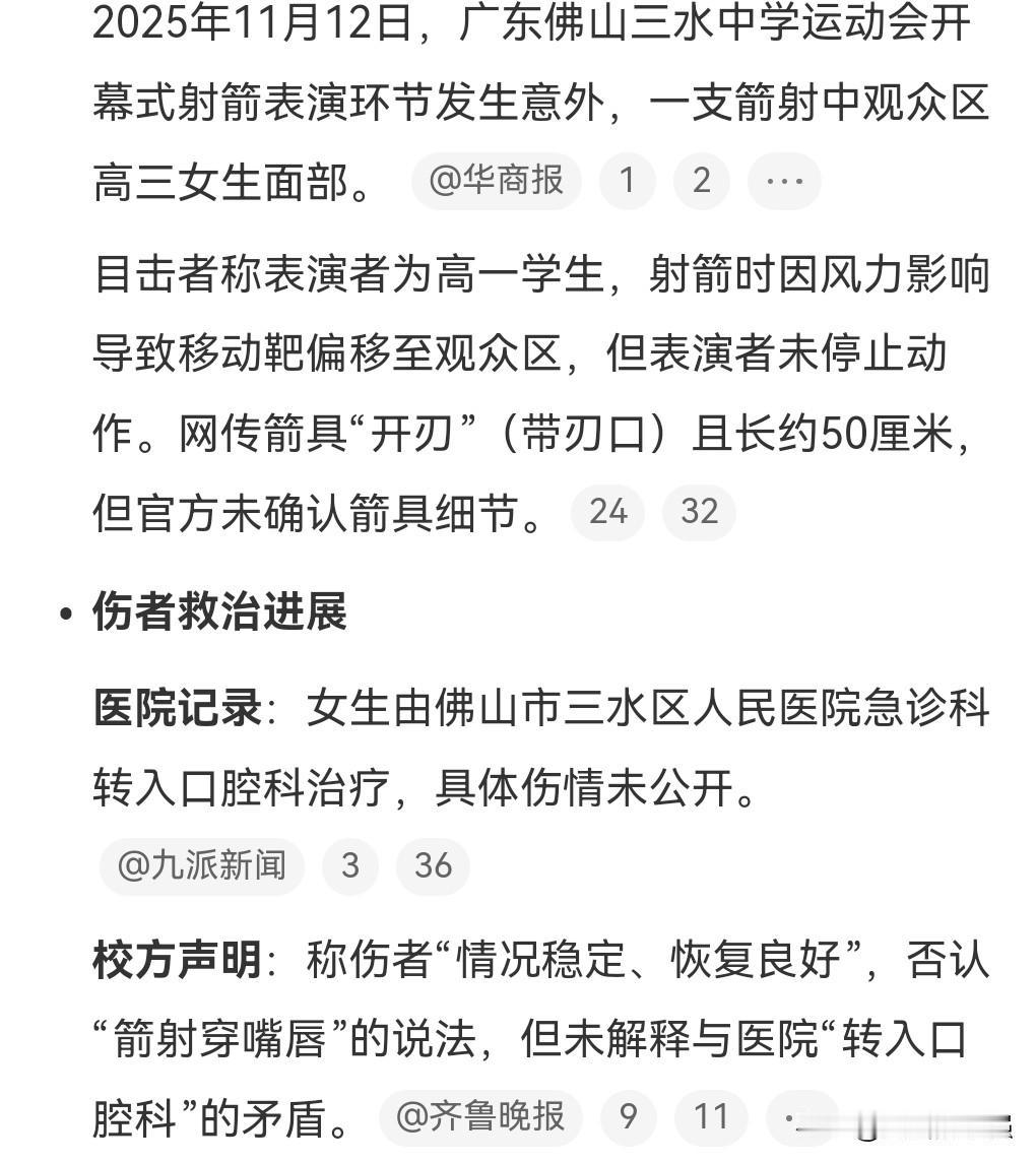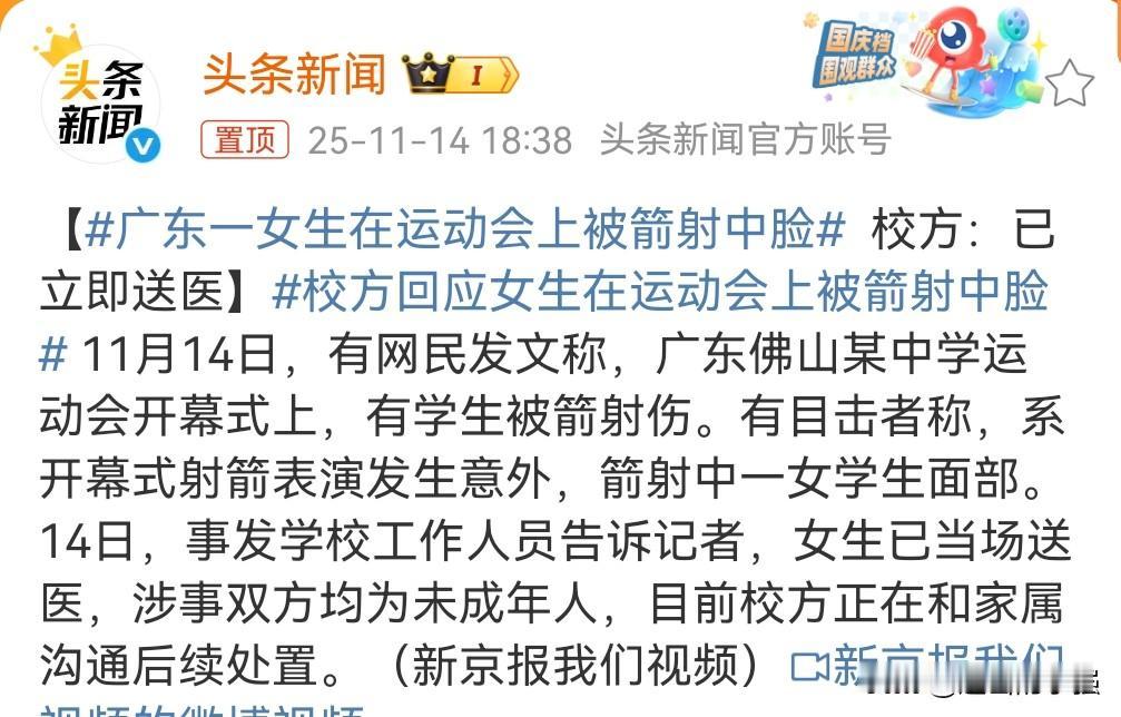 这也太离谱了。学校运动会竟然搞这么危险的表演。 11月14日在网上看到这么个消息。 一支箭竟然射中了观众席上的女生。 不知道为什么要有这样的表演,这实在是太危险了。 学校应该对此负责。