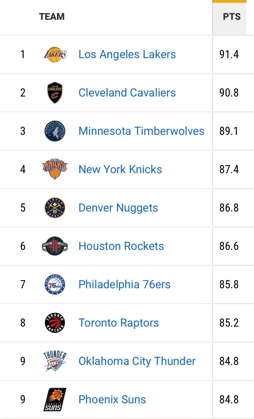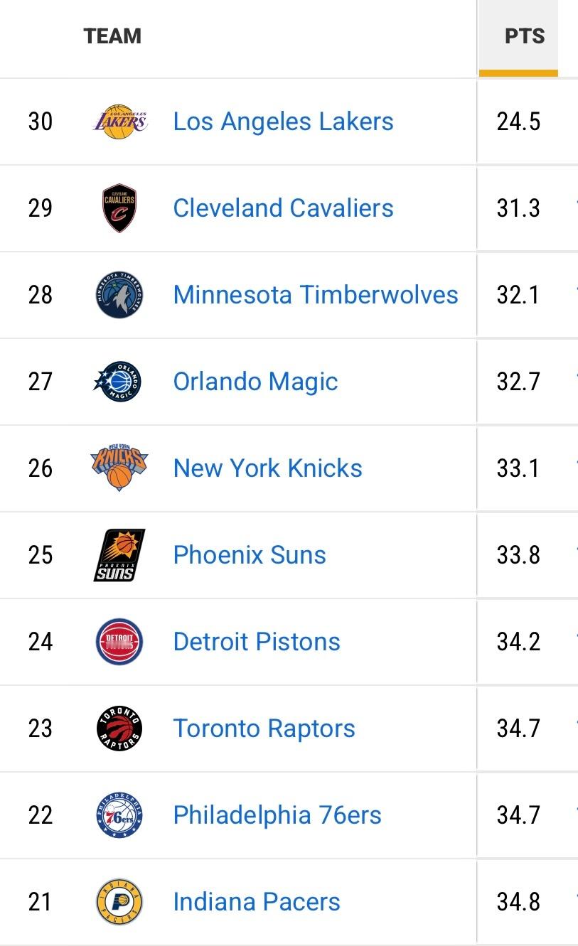 巧合?赛季开始至今,排在首发场均得分前三和板凳场均得分倒三的三支球队,居然都是湖人、骑士和森林狼。