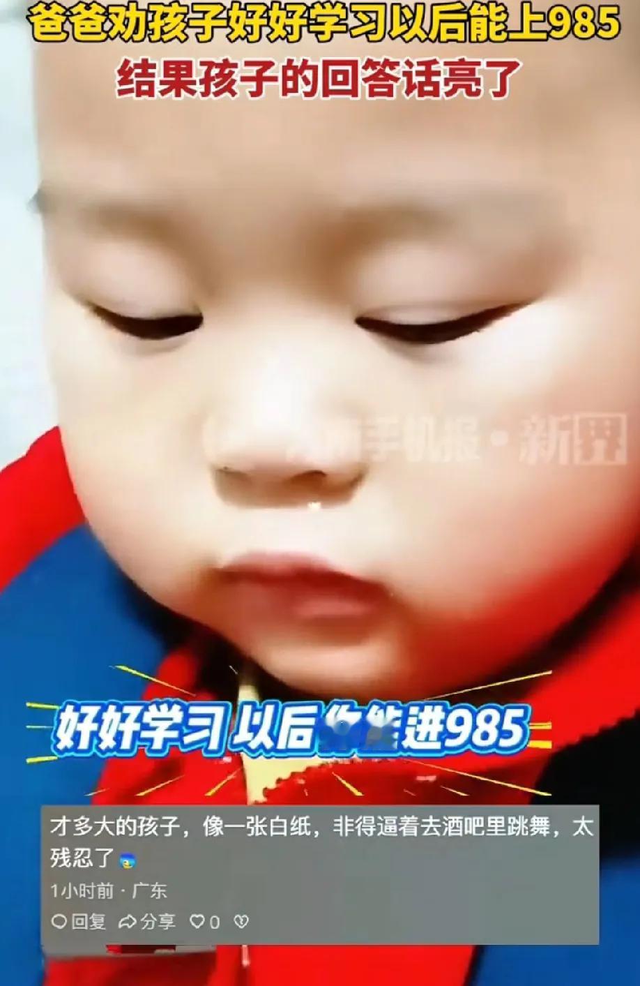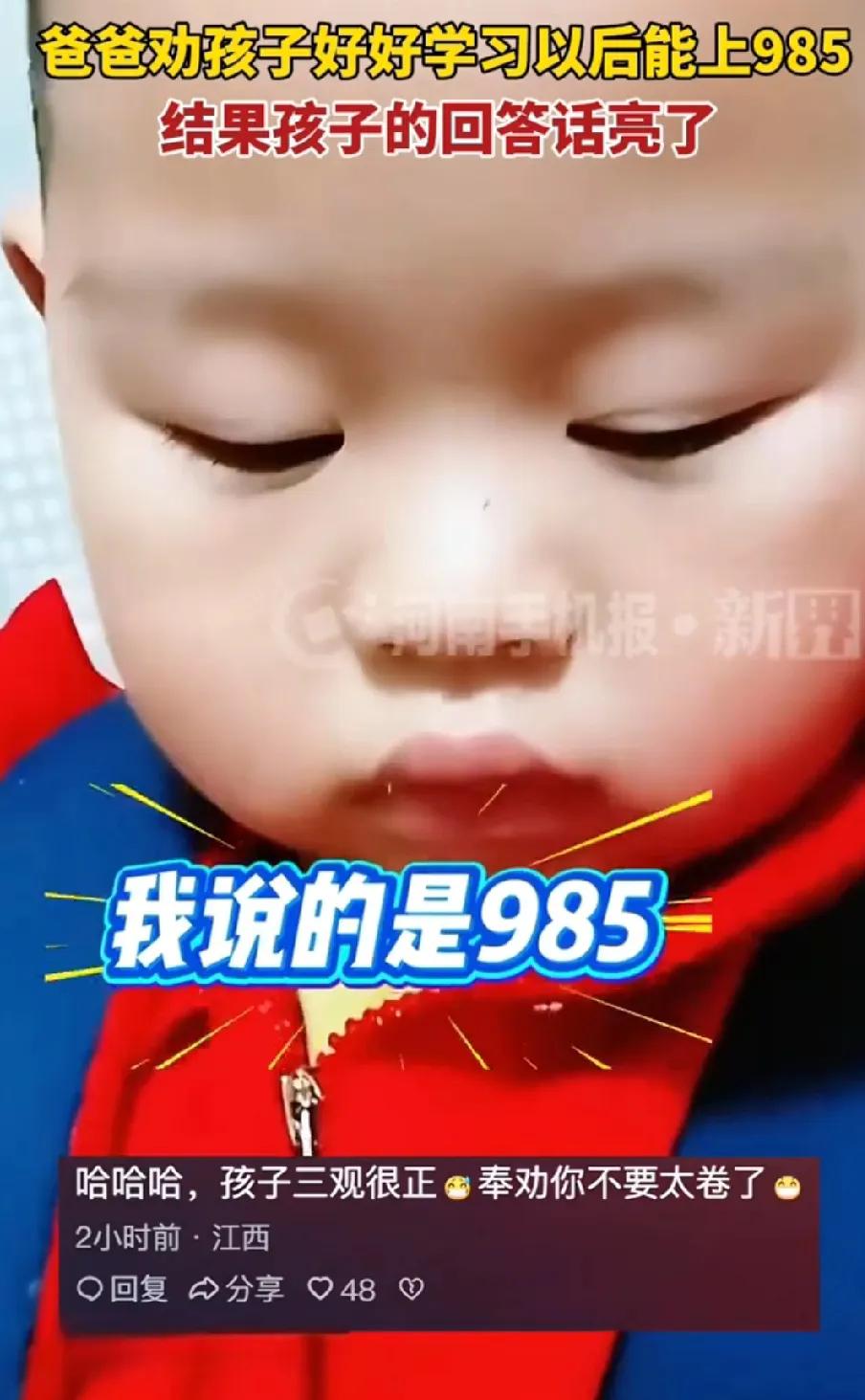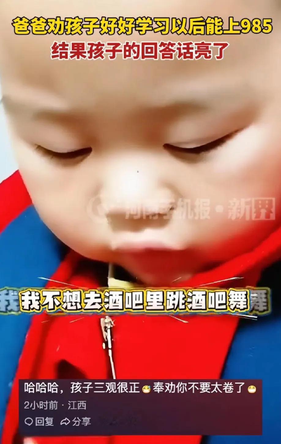 笑惨了!西安一孩子不想去上学 爸爸劝孩子好好学习,以后你能进985 结果孩子回答话亮了,我不想去酒吧里跳舞 原来985是酒吧舞,这解释绝了,新脑袋瓜子就是好使。 211、研究生是啥?网友给出了答案,总之一句话,我是正经人,不想跳舞,不爱摇摇,只想研究吃。 小孩哥前途无量,回答没毛病,有语言天赋。爸爸,顺其自然,莫要太卷! 但,这就是为什么要学习的理由,可以让自己有文化!
