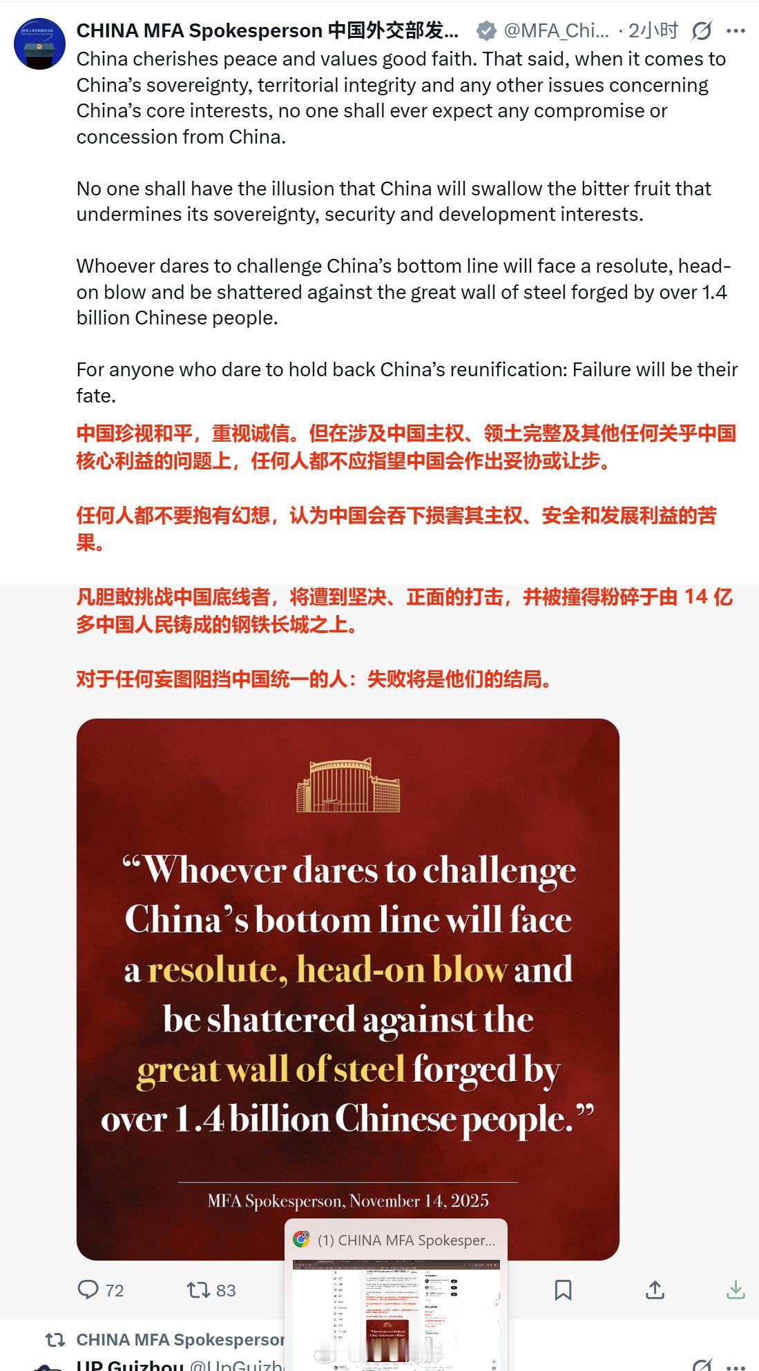 外交部官方推特刚刚发的,又是日文和英文。这次我国外交、涉台和军队的宣传口都是火力全开,因为事态严重性质和上次安倍晋三首次提出“台湾有事”时是完全不同的。多年前的2021年12月,“心胸开阔”的安倍晋三以前首相身份首次提出"台湾有事即日本有事"的言论。当时我国的反应也是非常迅速和激烈,事发当天外交部部长助理华春莹紧急约见了日本时任驻华大使垂秀夫,提出严正交涉。然后外交部发言人汪文斌也在例行记者会上表明了中方的坚决反对立场,此后国台办也出面发声斥责日方。而日本方面则采取了将“前首相安倍个人言论与日本政府切割”的低调回应,时任日本外相林芳正表示,政府不便对安倍作为前首相的个人言论进行评论,但同时强调了日方关于台海和平稳定的一贯立场。虽然安倍本人事后还在叫嚣“继续说该说的话”,但总体上当时岸田文雄内阁的外相采取了相对低调和回避的姿态。说这话的又确实是个前首相,此后才让事态慢慢降温。而这次,高市早苗是作为在任首相,于国会答辩上发表的“武力介入台湾问题”言论,虽然事后一些日本政要也批评高市早苗不该在此事上如此直白,完全缺乏经验,且高市本人又用“假设性回答”作为挡箭牌,并称未来将避免此类具体表述来为自己开脱,当局也找补说“日本对台湾问题没有改变历来的立场”。但说出去的话,就是泼出去的水,你就是在任首相,你就是说了,不给中方一个交代,只靠机械性的念经是回避不了问题本身的。在日本民间和朝野整体右倾狂热的情况下,高市早苗也很难收回她的话,否则右翼基本盘得生吃了她,但中方的怒火又是切实存在的,那么接下来,要么装死,单方面眼看着中方开始寄出后续招数(比如制裁),要么干脆一不做二不休彻底不管经济了和中方撕破脸再拉一波支持率。选一个吧,搞事女士。