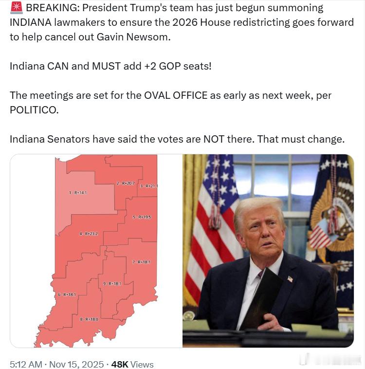 特朗普总统的团队已经开始召集印第安纳州立法者,确保 2026 年的众议院选区重划顺利推进,以帮助抵消加文·纽森的影响。印第安纳州可以而且必须新增 +2 个共和党席位!相关会议最快将在下周于椭圆形办公室举行。印第安纳州参议员表示,目前票数还不够。这一点必须改变。