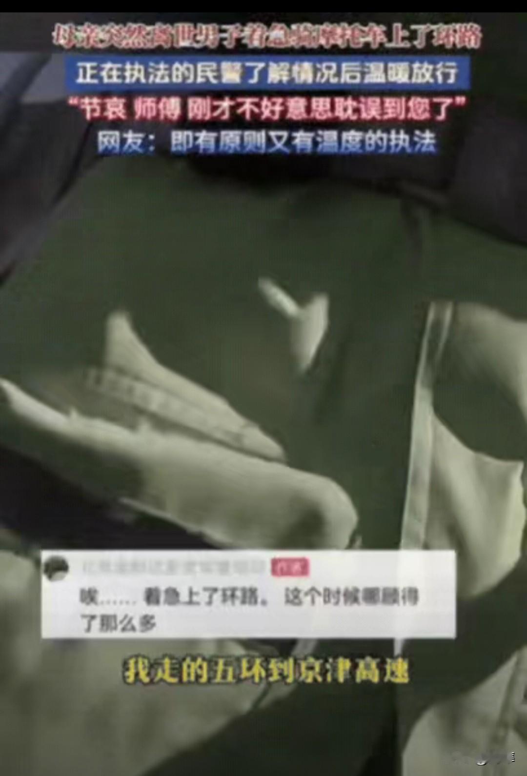北京五环路上,一名摩托车骑手被交警拦下。按照常理,摩托车上高速属违规,批评教育、依法处罚是标准流程。可当警官刚要开口,骑手却突然崩溃大哭:“警官,我妈没了!我要去看我妈!我不是故意的,我就是太着急了!”话音未落,泪水已夺眶而出,声音颤抖,心碎得让人心疼。 交警愣住了。原本要出口的训诫,硬生生咽了回去。他下意识收回了警棍,语气瞬间柔和:“回哪?”“通州。”“走什么路线?”“我打算走五环转京津高速。”交警沉默片刻,随即拿起对讲机:“稍等,我给你通报一下。”他没有选择机械执法,而是在规则与人情之间,寻得了一线温情的缝隙。 通报完毕,他轻轻点头,放行了这位骑手。临行前,只说了一句:“节哀师傅,刚不好意思,耽误到您了。”这句简单的话,像一束光照进悲痛的深渊。骑手抹着泪,深深鞠了一躬,哽咽着道谢,才缓缓发动摩托,消失在夜色中。 这一幕被路人拍下,迅速传遍网络。无数人看着看着,眼眶就红了。中国人最怕深夜的电话,最怕那句“家里出事了”。那一刻,什么规矩、什么处罚,都抵不过“见母亲最后一面”的执念。 人们感动的,不是交警放行了违规,而是他看见了规则背后那个活生生的人。摩托车不能上高速,是铁律,因为它关乎生命安全,绝不可随意打破。但这位骑手不是逞能炫技,而是奔丧心切。若此时只讲“法不容情”,冷面拦截,规矩是守住了,人心却凉了。 这位交警的可贵,正在于他懂得在“守规”与“共情”之间找平衡。他没有纵容违规,而是通过通报协调,为骑手争取了一条相对安全的通行路径。既未突破法律底线,又为悲痛之人留了一条路。 网友说得好:“拦你是本分,放你是情分。”执法的意义,从不在于冰冷地“管住人”,而在于有温度地“帮到人”。我们不怕严格,怕的是毫无温度的执行。真正的法治,不是无情,而是有度——德在纪前,纪在法前。在不危害公共安全的前提下,为孝心让道,正是法律应有的温度。 这起事件之所以刷屏,是因为它让我们看到:执法者也可以是温暖的。他们不是高高在上的规则执行机器,而是能共情、懂人心的普通人。这样的执法,拦得住违规,却拦不住人心的暖意;放行了一辆摩托,却温暖了整个网络。为这样的交警,真诚点赞。