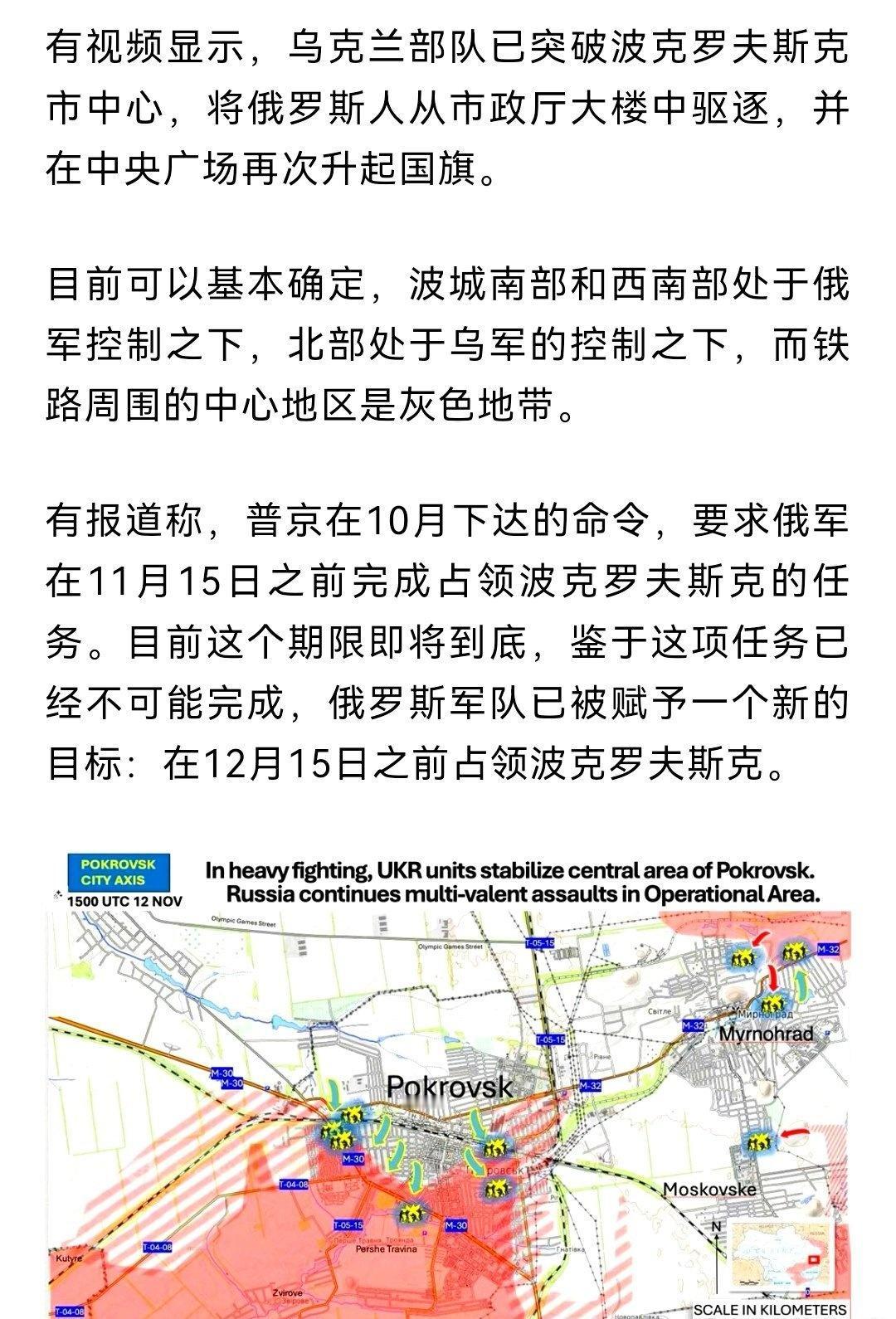 上海夜语晨曲 乌克兰顿涅茨克州波克罗夫斯克村(红军城)依然未被包围,亦未被俄军占领,乌克兰国旗仍在村中心议会大厦顶部高高飘荡。大蒂严令11月15前必须拿下被延期一个月,为12月15日前必须拿下“红军城”。