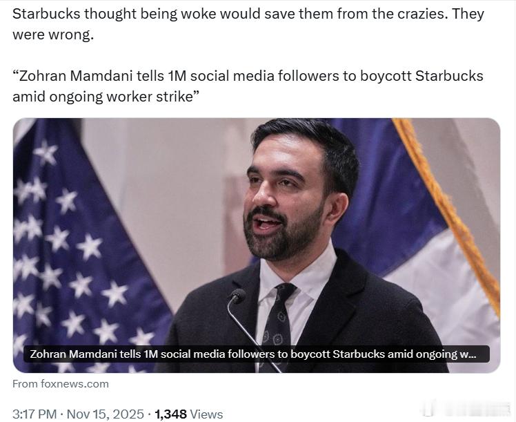 星巴克以为“觉醒”能够让他们躲过疯狂分子的攻击,他们错了。“佐兰• 曼达尼正呼吁100万社交媒体粉丝在持续的员工罢工期间抵制星巴克。”