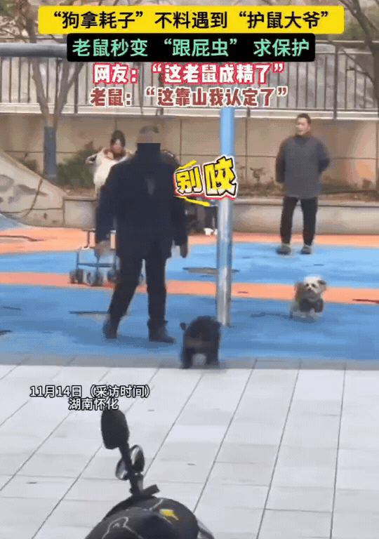 湖南怀化,小区广场上,一只黑狗在调戏一只老鼠。老鼠瑟瑟发抖,不敢动弹。大爷驱赶黑狗,开始以为大爷在保护黑狗,后面才知道是老鼠找到了靠山。 空旷的广场上,一只黑狗在追逐一只老鼠,老鼠没地方藏身,也不敢跑。一位大爷看到这样的情况,一直在驱赶黑狗,赶走了,又回来了。老鼠总算找到了靠山,躲在大爷脚边不出来了。 开始以为黑狗是大爷家的,大爷驱赶黑狗是怕它吃老鼠传染疾病。看到后面是大爷在保护老鼠。虽然老鼠是害虫,面对一条小生命,大爷也不忍心看着它被狗咬死。 这只老鼠也挺聪明,知道大爷是在保护它,就赖在大爷脚边不走了。据说老鼠的智商相当于7、8岁的儿童,在啮齿类动物中是智商较高的代表。我们不要小看老鼠这种动物。