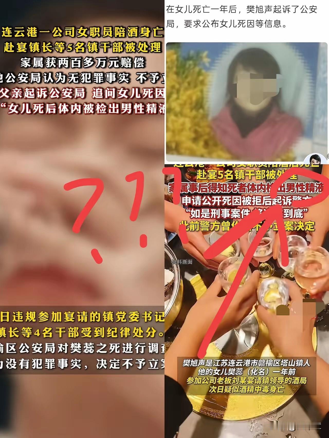 连云港有家叫昌隆的公司,女主任樊蕊陪着5个镇干部喝酒,喝了不少。晚上散场后,公司老板刘某把她扶进了卧室,结果第二天樊蕊就没了性命。 这场夺命酒局藏着太多让人脊背发凉的细节。事发2024年2月23日,元宵节前一天,5名镇干部包括党委书记、镇长在内,应公司老板刘某之邀赴宴——说白了,就是企业想靠饭局维系和监管部门的关系。 酒桌上,樊蕊被推到了敬酒前线,短短时间里连着喝下4杯白酒,每杯足足2两,这哪里是应酬,分明是拿健康赌前程。 更讽刺的是,两名女干部全程滴酒不沾,却看着下属企业的女职员被劝酒到失控。 散场时镇党委书记还假意交代“照顾好樊蕊”,转头就把人丢给了老板刘某。 谁能想到,这份“照顾”竟是把醉酒不醒的樊蕊扶进老板办公室的套间卧室,而当晚两人发生了性关系,直到第二天早上刘某才发现樊蕊没了呼吸。 家属的悲痛里满是不甘和疑点。61岁的老父亲樊旭声赶到殡仪馆时,女儿肚脐以下有青紫痕迹,法医初步判断酒精中毒,但他多次要求尸检都没被允许。 更让他崩溃的是,事后才得知女儿体内检出了刘某的精液,可警方却以“没有犯罪事实”不予立案,还称两人是“情人关系”。 关键的监控视频被说“设备故障”,申请公开调查结论却被答复属于“刑事案件类信息”,种种推诿让死因变得更加扑朔迷离。 两百多万元的赔偿款似乎想抹平一切,5名违规接受宴请的镇干部也只受到党内警告或诫勉谈话的处分。 但这场悲剧根本不是简单的“饮酒过量”,而是畸形酒桌文化、权力寻租与责任缺失酿成的恶果。 强迫下属陪酒、违规接受管理服务对象宴请,这些行为早就违反了中央八项规定和职场底线,更违背了法律准则——法律明确规定,强迫他人饮酒造成损害,相关责任人要承担法律责任。 樊蕊的遭遇不是个例,多少职场人被“不喝就是不给面子”的歪理绑架,多少权力寻租借着酒局的幌子暗箱操作。 当应酬变成夺命陷阱,当规则让位于潜规则,受伤的永远是普通劳动者。 真相不该被金钱掩盖,责任更不能轻描淡写。 各位读者你们怎么看?这场悲剧该由谁来真正买单?欢迎在评论区讨论。