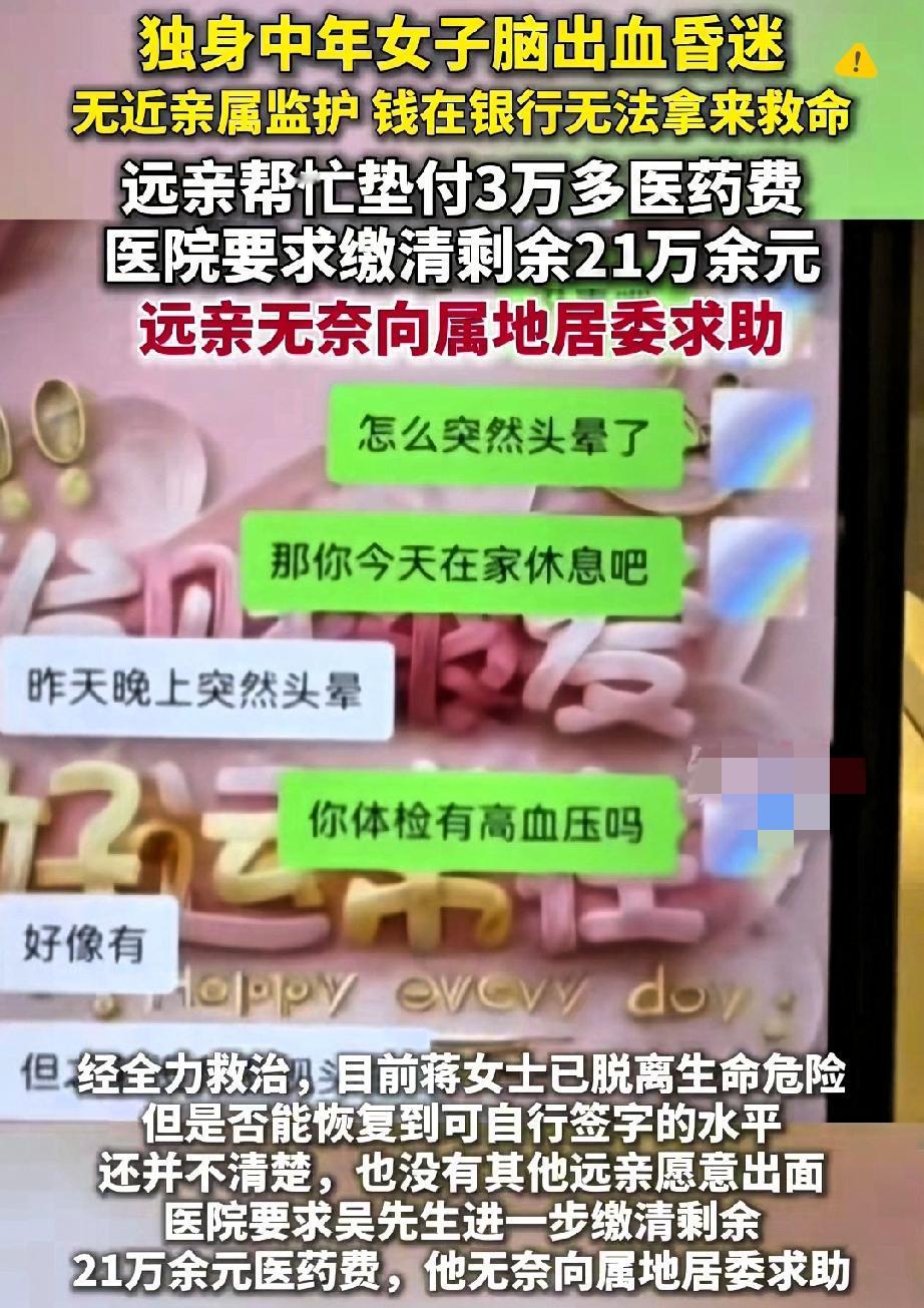 46岁独居阿姨突发脑溢血,没亲人没子女,远房亲戚签字垫钱后扛不住21万医药费,居委会想帮忙当监护人却被保险公司、银行拒之门外——这事儿真的给所有独身人士敲了警钟! 谁能想到,平时看着独立自由的独居生活,遇到突发疾病竟会陷入“没人签字、没钱治病”的两难? 蒋女士的遭遇不是个例,随着不婚不育的人越来越多,这种“老无所依”的风险其实离我们很近。 很多人觉得年轻时候攒钱、买保险就够了,但蒋女士明明有重疾险、有工资存款,却因为没合法监护人,救命钱就是拿不出来。 这说明提前规划监护人才是关键,民法典里的意定监护、遗赠扶养协议,真不是摆设,而是独身人士的“救命符”。 别等意外来了才慌神,趁清醒时找个信任的人或组织签好协议,把身后事安排明白,才是对自己负责。 你觉得独身人士还该提前做好哪些保障?来评论区聊聊你的看法~