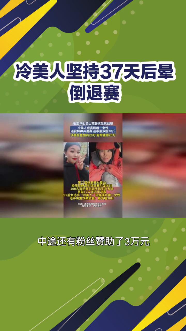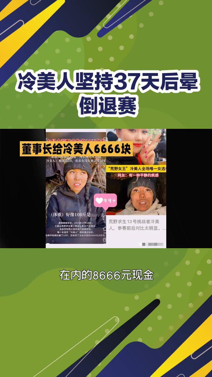 冷美人坚持37天后晕倒退倒赛。 湖南张家界七星山荒野求生赛中,冷美人坚持37天后晕倒退赛,竟意外收获8666元奖励,这背后的故事究竟如何? 在湖南张家界举行的七星山荒野求生赛中,一名名为"冷美人"的参赛者凭借惊人的毅力坚持了37天,最终因营养不良晕倒被送往医院。尽管未能晋级决赛,冷美人仍获得了包括董事长特别奖励在内的8666元现金。 据赛事策划龙先生透露,中途还有粉丝赞助了3万元,其他参赛者平均每人分得2000元。此外,赛事赞助商还将在未来两天内为冷美人发放慰问金。冷美人的行为不仅赢得了观众的关注和支持,也展现了女性在极限挑战中的坚韧力量。