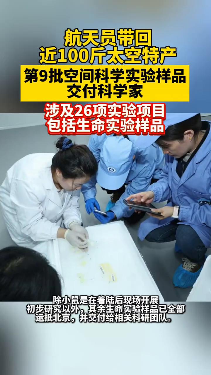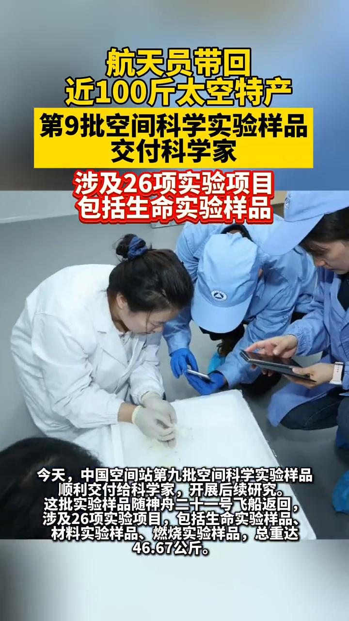 航天员带回近100斤太空特产。 第9批空间科学实验样品交付科学家,涉及26项实验项目,包括生命实验样品。 今天,中国空间站第九批空间科学实验样品顺利交付给科学家,开展后续研究。这批实验样品随神舟二十一号飞船返回,涉及26项实验项目,包括生命实验样品、材料实验样品、燃烧实验样品,总重达46.67公斤。除小鼠是在着陆后现场开展初步研究以外,其余生命实验样品已全部运抵北京,并交付给相关科研团队。