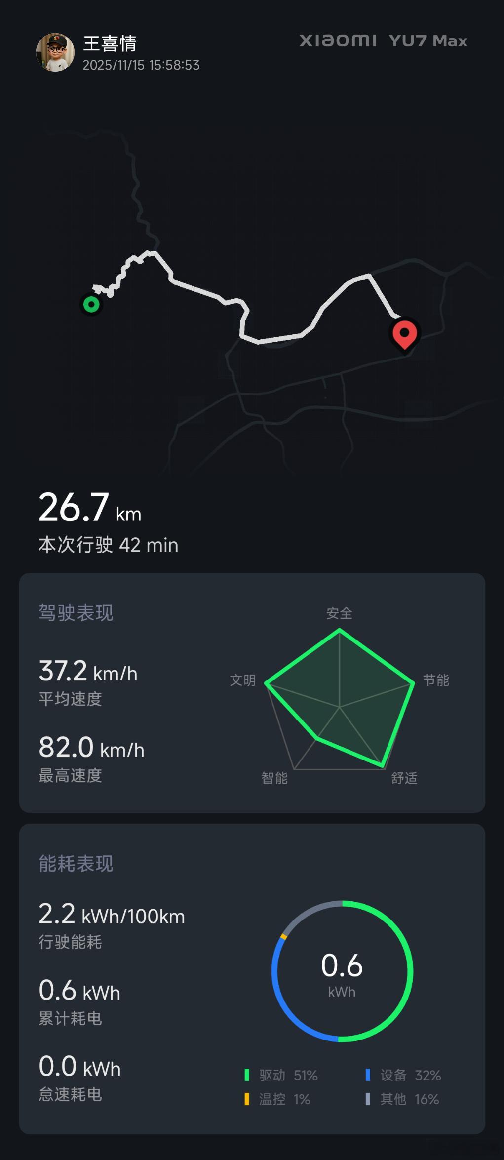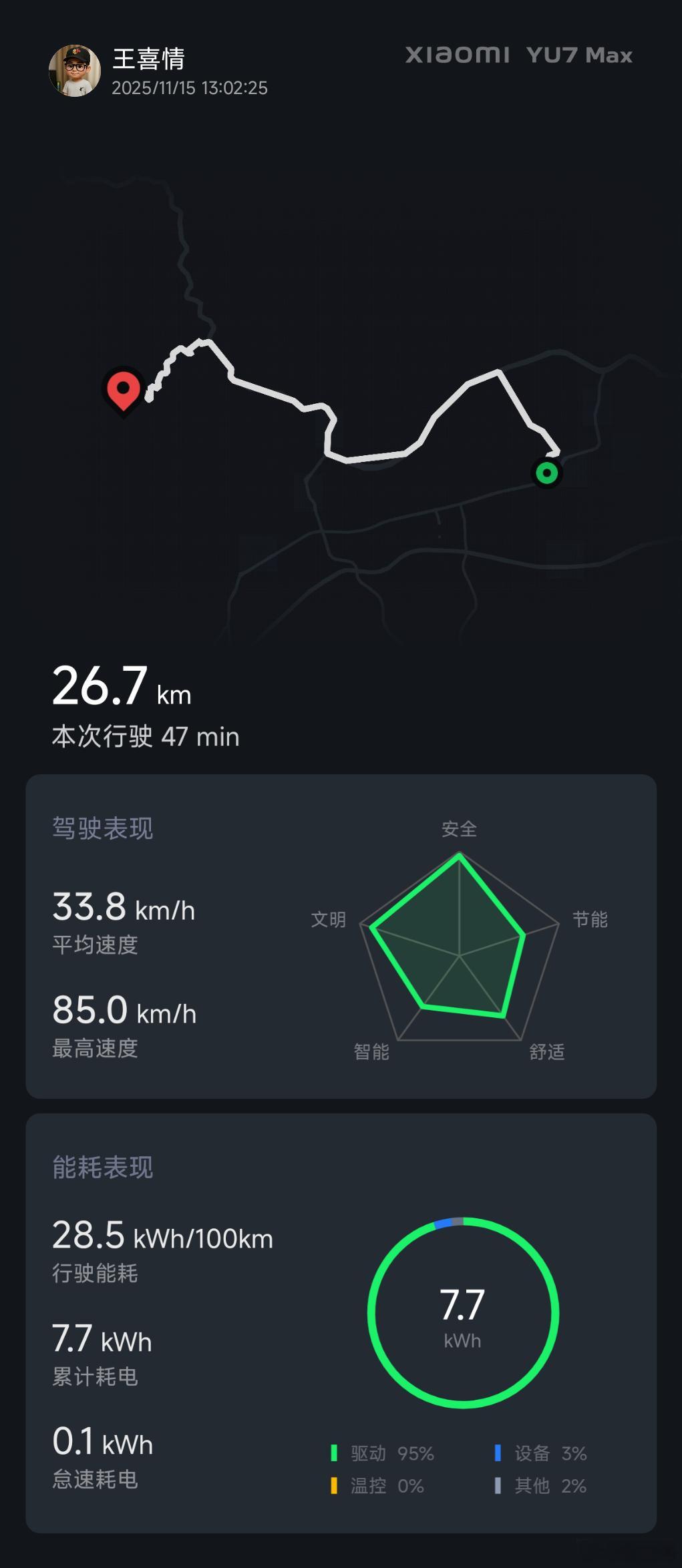 26.7km上坡路能耗开了28.5kWh/100km回来都是下坡路多,开了2.2kWh/100km