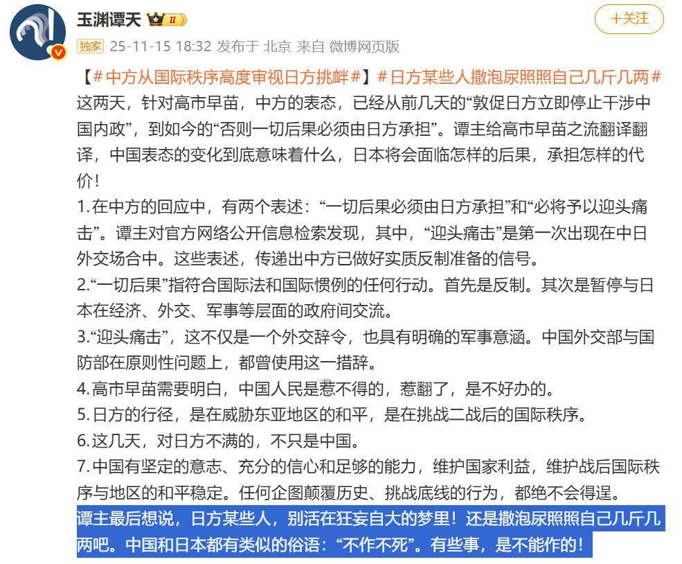 大国雅言持续输出,面对日本高官的挑衅,央视旗下账号“玉渊谭天”发文称:日方某些人撒泡尿照照自己几斤几两……
